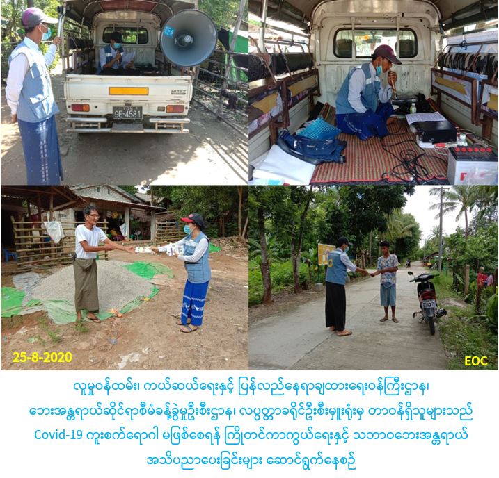 လူမှုဝန်ထမ်း၊ ကယ်ဆယ်ရေးနှင့် ပြန်လည်နေရာချထားရေးဝန်ကြီးဌာန၊ ဘေးအန္တရာယ်ဆိုင်ရာစီမံခန့်ခွဲမှုဦးစီးဌာန၊ လပွတ္တာခရိုင်ဦးစီးမှူးရုံးမှ တာဝန်ရှိသူများသည် (၂၅-၈-၂၀၂၀) ရက်နေ့၊ (၀၈း၀၀) နာရီအချိန်၌ အထွေထွေအုပ်ချုပ်ရေးဦးစီးဌာန နှင့် အတူပူးပေါင်း၍ လပွတ္တာမြို့နယ်၊ မောင်းဒီးကျေးရွာအုပ်စု၊ ကျောက်အိုင်ကျေးရွာ၊ စမ်းကြီးကုန်းကျေးရွာ၊ ကျွန်းကလေး ကျေးရွာ၊ဂေါင်းတိုကျေးရွာ၊ချောင်းဖျားကျေးရွာများတို့တွင်(ဒုတိယအကြိမ်) Covid-19 ကူးစက်ရောဂါ ဆိုင်ရာနှင့် ပတ်သက်၍ ကျန်းမာရေးနှင့်အားကစား၀န်ကြီးဌာနမှ ထုတ်ပြန်ထားသည့် အသိပေးကြေညာချက်များ၊ သဘာဝဘေးအန္တရာယ်ဆိုင်ရာ အသိပညာပေးခြင်း၊ လက်ကမ်းစာစောင်များဝေငှခြင်းများကို အများပြည်သူများသိရှိလိုက်နာရန်ကွင်းဆင်း၍ Loud Speaker ဖြင့်လှည့်လှည်၍ အသိပညာပေးလုပ်ငန်းများ ပြုလုပ်ဆောင်ရွက်ခဲ့ပါကြောင်း သတင်းရရှိပါသည်။
