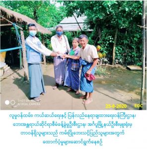 လူမှုဝန်ထမ်း၊ ကယ်ဆယ်ရေးနှင့် ပြန်လည်နေရာချထားရေးဝန်ကြီးဌာန၊ ဘေးအန္တရာယ်ဆိုင်ရာစီမံခန့်ခွဲမှုဦးစီးဌာန၊ အင်္ဂပူမြို့နယ်ဦးစီးမှူးရုံးမှ တာဝန်ရှိသူများသည် (၂၄-၈-၂၀၂၀) ရက်နေ့၌ အင်္ဂပူမြို့နယ်၊ နောက်မီးကျေးရွာအုပ်စု၊နောက်မီးအရှေ့ဘက်ကမ်းကျေးရွာတွင် ဖြစ်ပွားခဲ့သော ကမ်းပြိုဘေးကြောင့် ကြိုတင်ပြောင်းရွှေ့ အိမ်ခြေ (၁) လုံး၊ အိမ်ထောင်စု (၁)စုရှိ လူဦးရေ(၃)ဦးတို့အတွက် အိမ်ဆောက်ပစ္စည်းဖိုးထောက်ပံ့ငွေ(၁၀၀၀၀၀/-)ကျပ်၊ဆန်ရိက္ခာ(၇)ရက်စာဖိုးထောက်ပံ့ငွေ (၆၃၀၀/-)ကျပ် စုစုပေါင်းထောက်ပံ့ရန်ပုံငွေ(၁၀၆၃၀၀/-)ကျပ်ကို (၂၅-၈-၂၀၂၀)ရက်နေ့(၁၄:၀၀)နာရီ အချိန်တွင် တာ၀န်ရှိသူများနှင့်အတူဘေးသင့်ပြည်သူများလက်ဝယ်အရောက်ထောက်ပံ့ပေးအပ်ခဲ့ပါကြောင်း သတင်းရရှိပါသည်။
