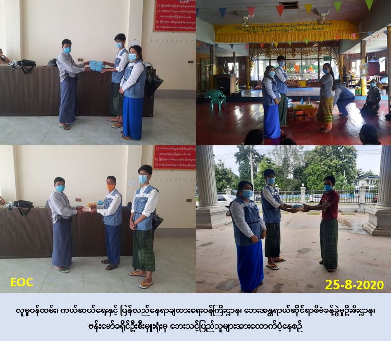 လူမှုဝန်ထမ်း၊ ကယ်ဆယ်ရေးနှင့် ပြန်လည်နေရာချထားရေးဝန်ကြီးဌာန၊ ဘေးအန္တရာယ်ဆိုင်ရာ စီမံခန့်ခွဲမှုဦးစီးဌာန၊ ဗန်းမော်ခရိုင်ဦးစီးမှူးရုံးမှ တာဝန်ရှိသူများသည် ဗန်းမော်ခရိုင်၊ ဗန်းမော်မြို့ နယ်တွင်(၂၀-၈-၂၀၂၀)ရက်နေ့မှ(၂၁-၈-၂၀၂၀)ရက်နေ့အထိ ဧရာဝတီမြစ်ရေမြင့်တက်လာမှု ကြောင့် မြစ်ကမ်းဘေးနှင့် မြေနိမ့်ပိုင်းများတွင်နေထိုင်သော မံပင်ကျေးရွာ၊ ငှက်ပျော တောကျေးရွာ၊ မိုင်းကာကျေးရွာ၊ လက်ပံတန်းကျေးရွာများရှိ ရေဘေးပြောင်းရွှေ့ အိမ်ထောင်စု(၈၆)စု၊ လူဦးရေ(၄၉၇)ဦးတို့အတွက် အဝတ် Mask(၄၉၇)ခု၊ ဆပ် ပြာ(၈၆)တောင့်နှင့် ဆန်(၇)ရက်စာဖိုးထောက်ပံ့ငွေ(၁,၀၄၃,၇၀ဝ/-)ကျပ်တို့အား(၂၅-၈-၂၀၂၀)ရက်နေ့ ၊ မွန်းလွှဲ(၁၄:၃၀)နာရီအချိန်တွင် သွားရောက်ထောက်ပံ့ခဲ့ကြောင်း သတင်းရရှိပါသည်။