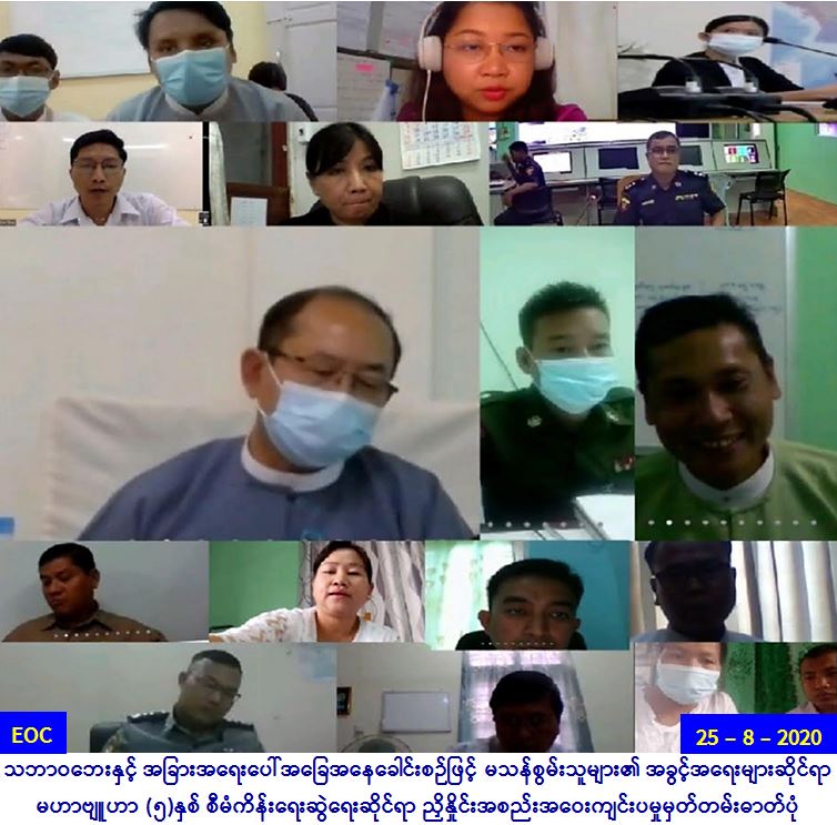 အစည်းအဝေးကို Video Conferencing စနစ်ဖြင့် ကျင်းပခဲ့ပြီး သဘာဝဘေးနှင့် အခြားအရေးပေါ်အခြေအနေဆိုင်ရာ ဆပ်ကော်မတီဝင်များ၊ အခြားဆပ်ကော်မတီ (၈) ခုမှ ကိုယ်စားလှယ်များ၊ နေပြည်တော် ပြည်ထောင်စုနယ်မြေအပါအဝင် မသန်စွမ်းသူများ၏အခွင့် အရေးများဆိုင်ရာ တိုင်းဒေသကြီး/ ပြည်နယ်ကော်မတီဝင်များနှင့် UNICEF (မြန်မာ) မှ တာဝန်ရှိသူ များ တက်ရောက်ကြကြောင်း သတင်းရရှိပါသည်။