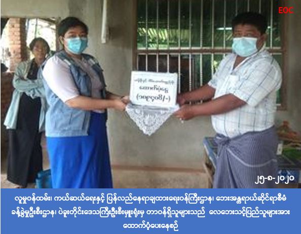 လူမှုဝန်ထမ်း၊ ကယ်ဆယ်ရေးနှင့် ပြန်လည်နေရာချထားရေးဝန်ကြီးဌာန၊ ဘေးအန္တရာယ်ဆိုင်ရာ စီမံခန့်ခွဲမှုဦးစီး ဌာန၊ ပဲခူးတိုင်းဒေသကြီး ဦးစီးမှူးရုံးမှ တာဝန်ရှိသူများသည် (၂၅-၈-၂၀၂၀)ရက်နေ့၊ သနပ်ပင်မြို့နယ်၊ ရွာသစ်ပိုင်း ရပ်ကွက်တွင် ဖြစ်ပွားခဲ့သော လေဘေးကြောင့် အမိုးလန်နေအိမ်(၄)လုံးအတွက် အိမ်ဆောက်ပစ္စည်းဖိုး ထောက်ပံ့ ငွေ (၁၆၀,၀၀၀)ကျပ်၊ အိမ်ထောင်စု(၄)စုရှိ လူဦးရေ(၁၄)ဦးတို့အတွက် ဆန်ရိက္ခာ(၇)ရက်စာဖိုးထောက်ပံ့ငွေ (၂၉,၄၀၀) ကျပ်၊ စုစုပေါင်းထောက်ပံ့ငွေ (၁၈၉,၄၀၀) ကျပ်တို့ကို (၂၅.၈.၂၀၂၀)ရက်နေ့ (၁၅:၀၀)နာရီအချိန်တွင် ဘေးသင့်ပြည်သူများလက်ဝယ်ထံသို့ သွားရောက်ထောက်ပံ့ပေးခဲ့ကြောင်း သိရှိရပါသည်။