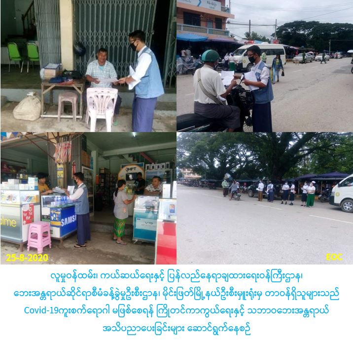 လူမှုဝန်ထမ်း၊ ကယ်ဆယ်ရေးနှင့် ပြန်လည်နေရာချထားရေးဝန်ကြီးဌာန၊ ဘေးအန္တရာယ်ဆိုင်ရာစီမံခန့်ခွဲမှုဦးစီးဌာန၊ မိုင်းဖြတ်မြို့နယ်ဦးစီးမှူးရုံးမှ တာဝန်ရှိသူများသည် (၂၅-၈-၂၀၂၀) ရက်နေ့တွင် မြို့နယ်အုပ်ချုပ်ရေးမှူး၊ မြို့နယ်ကျန်းမာရေးဌာန၊ မြို့နယ်ပြန်ဆက်ဦးစီးမှူး၊ မြို့နယ်ကြက်ခြေနီအဖွဲ့တို့နှင့်အတူ ဈေးတန်းရပ်ကွက်နှင့်မြို့မဈေးရှေ့တို့တွင် COVID-19 ကူးစက်ရောဂါ ပြန့်ပွားမှုမဖြစ်ပွားစေရန်အတွက် သိရှိလိုက်နာရန်အချက်များနှင့် သဘာဝဘေးဆိုင်ရာအသိပညာပေးခြင်းများကို Hand Speaker ဖြင့် လှည့်လည်ဟောပြောခဲ့ပြီး အသိပညာပေးလက်ကမ်းစာစောင်များ ဖြန့်ဝေပေးခဲ့ပါကြောင်း သတင်းရရှိပါသည်။