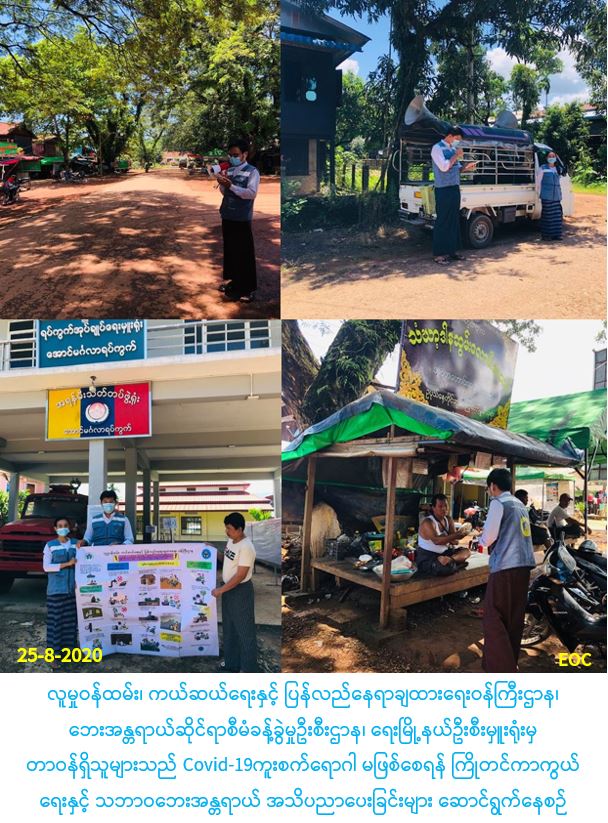 လူမှုဝန်ထမ်း၊ ကယ်ဆယ်ရေးနှင့် ပြန်လည်နေရာချထားရေးဝန်ကြီးဌာန၊ ဘေးအန္တရာယ်ဆိုင်ရာစီမံခန့်ခွဲမှုဦးစီးဌာန၊ ရေးမြို့နယ်ဦးစီးမှူးရုံးမှ တာဝန်ရှိသူများသည် (၂၅-၈-၂၀၂၀) ရက်နေ့ (၁၀:၀၀) နာရီအချိန်မှ (၁၄:၀၀) နာရီအချိန်အထိ မွန်ပြည်နယ်၊ မော်လမြိုင်ခရိုင်၊ ရေးမြို့နယ်၊ အောင်မေတ္တာရပ်ကွက်၊ အောင်မင်္ဂလာရပ်ကွက်နှင့် သီရိနန္နါရပ်ကွက်တို့တွင် COVID-19 ရောဂါကူးစက်ပြန့်နှံ့မှု မဖြစ်ပွားစေရေးနှင့် မိုးရာသီကာလအတွင်းဖြစ်ပွားလေ့ရှိသည့် မိုးကြိုးဘေး၊ မုန်တိုင်းဘေး၊ ရေဘေး၊ မြေပြိုဘေးအန္တရာယ်များကြိုတင်ပြင်ဆင်ရေးအသိပညာပေးခြင်းနှင့် လက်ကမ်းစာစောင်များ ဖြန့်ဝေပေးခဲ့ခြင်းနှင့် ဗီနိုင်းပိုစတာပေးအပ်ခြင်းများ ဆောင်ရွက်ခဲ့ပါကြောင်း သတင်းရရှိပါသည်။