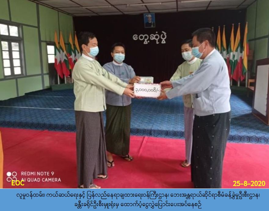 လူမှု၀န်ထမ်း၊ ကယ်ဆယ်ရေးနှင့်ပြန်လည်နေရာချထားရေး၀န်ကြီးဌာန၊ ဘေးအန္တရာယ်ဆိုင်ရာ စီမံခန့်ခွဲမှုဦးစီးဌာန၊ ခန္တီးခရိုင်ဦးစီးမှူးရုံးမှ တာ၀န်ရှိသူများသည် COVID 19 ကူးစက်ရောဂါ ဖြစ်ပွားနေစဉ်ကာလအတွင်း Facllity Quarantine Center အဖြစ် အသုံးပြုနိုင်သည့် ခန္တီးမြို့နှင့် ဟုမ္မလင်းမြို့ရှိ Shelter များတွင် တပ်ဆင်ရန် စုစုပေါင်းဘေစင် (၆) ခု၊ ရေသိုလှောင်ကန်၊ ပိုက်နှင့် ဆက်စပ်ပစ္စည်းများတပ်ဆင်ရန် shelter(၁) လုံး လှျင်တန်ဖိုးငွေ (၁,၅၀၀,၀၀၀/-) ကျပ်နှုန်း ဖြင့်(၂) လုံးအတွက် စုစုပေါင်းငွေ (၃,၀၀၀,၀၀၀) ကျပ်တိတိအား(၂၅-၈-၂၀၂၀)ရက်နေ့ (၁၀:၀၀) နာရီအချိန်တွင် ခရိုင်အုပ်ချုပ်ရေးမှူး၊ မြို့နယ်အုပ်ချုပ်ရေးမှူးတို့နှင့်အတူ ခရိုင်ပညာ ရေးမှူးထံ သို့လွှဲပြောင်းထောက်ပံ့ခဲ့ပါကြောင်း သတင်းရရှိပါသည်။