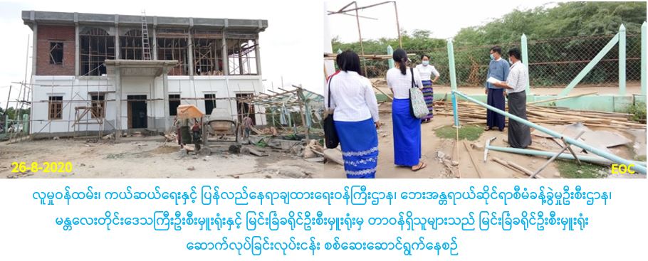 လူမှုဝန်ထမ်း၊ ကယ်ဆယ်ရေးနှင့် ပြန်လည်နေရာချထားရေးဝန်ကြီးဌာန၊ ဘေးအန္တရာယ်ဆိုင်ရာစီမံခန့်ခွဲမှုဦးစီးဌာန၊ မန္တလေးတိုင်းဒေသကြီးဦးစီးမှူးရုံးနှင့် မြင်းခြံခရိုင်ဦးစီးမှူးရုံးမှ တာဝန်ရှိသူများသည် (၂၆-၈-၂၀၂၀) ရက်နေ့၊ (၁၁း၁၅) နာရီအချိန် တွင် မြင်းခြံခရိုင်ဦးစီးမှူးရုံး (၆၀’×၄၀’×၂၈’) ပေ RCC(၂)ထပ် သွပ်မိုး၊ ကွန်ကရစ်၊ ကြမ်းခင်း၊ ရေ၊ မီး၊ မိလ္လာအပါအဝင် ဆောက်လုပ်ခြင်းလုပ်ငန်း (၈၀%) ရာခိုင်နှုန်း ပြီးစီးမှု အခြေအနေအား မန္တလေးတိုင်းဒေသကြီးဦးစီးမှူးရုံးမှ ညွှန်ကြားရေးမှူးနှင့် တာဝန်ရှိသူများ၊ သစ်လွင်ဦးကုမ္ပဏီမှ တာဝန်ယူတည်ဆောက်လျက်ရှိသည့် တာဝန်ခံများနှင့်အတူ ကွင်းဆင်း စစ်ဆေးခဲ့ပါ ကြောင်း သတင်းရရှိပါသည်။