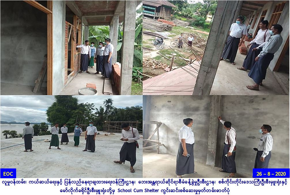 လူမှုဝန်ထမ်း၊ ကယ်ဆယ်ရေးနှင့် ပြန်လည်နေရာချထားရေး ဝန်ကြီးဌာန၊ ဘေးအန္တရာယ်ဆိုင်ရာစီမံခန့်ခွဲမှုဦးစီးဌာန၊ စစ်ကိုင်း တိုင်းဒေသကြီးဦးစီးမှူးရုံးနှင့် မော်လိုက်ခရိုင်ဦးစီးမှူးရုံးတို့မှ တာဝန်ရှိသူများသည် (၂၆ ၈.၂၀၂၀) ရက်နေ့ နံနက် (၀၉:၀၀) အချိန်တွင် မော်လိုက်မြို့နယ်၊ ကင်းတပ်စံပြကျေးရွာ၊ (အ.မ.က) ကျောင်းဝင်းအတွင်း ထူးသန့်လွင်ကုမ္ပဏီမှ တာဝန်ယူ တည်ဆောက်လျက်ရှိသည့် School Cum Shelter တည်ဆောက်ရေးလုပ်ငန်းခွင်အား ကွင်းဆင်းကြည့်ရှု့စစ် ဆေးခဲ့ပါကြောင်း သတင်းရရှိပါသည်။