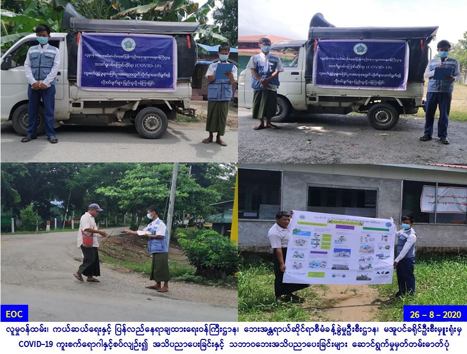 လူမှုဝန်ထမ်း၊ ကယ်ဆယ်ရေးနှင့် ပြန်လည်နေရာချထားရေး ဝန်ကြီးဌာန၊ ဘေးအန္တရာယ်ဆိုင်ရာစီမံခန့်ခွဲမှုဦးစီးဌာန၊ မအူပင်ခရိုင် ဦးစီးမှူးရုံးမှ တာဝန်ရှိသူများသည် (၂၆-၈-၂၀၂၀)ရက်နေ့တွင် မအူပင်မြို့နယ်၊ မလတ်တိုကျေးရွာအုပ်စုရှိ ရှေ့ဘက်ကမ်း ကျေးရွာ၊နောက်ဘက် ကမ်းရွာ၊ လှိုင်းတာကျေးရွာ၊ တပွတ်တနောင်ကျေးရွာနှင့် ဖိုးရာဝဲကျေးရွာတို့၌ COVID-19 ရောဂါကူးစက်ပျံ့နှံ့မှု ဒုတိယလှိုင်း မဖြစ်ပွားစေရန် အများပြည်သူအလွယ်တကူသိရှိလိုက်နာ ဆောင်ရွက်ရန်အချက်များနှင့် မိုးရာသီတွင် ဖြစ်ပွားလေ့ရှိသည့် သဘာဝဘေး အန္တရာယ်များကြိုတင်ပြင်ဆင်ရေး အသိပေးချက်များကို လှည်လည်ဟောပြောခြင်း၊ အသိပညာပေးဗီနိုင်းပိုစတာဖြန့်ဝေခြင်းနှင့် ဘေး (၈)မျိုးလက်ကမ်းစာစောင် ဝေငှခြင်းများ ဆောင်ရွက်ခဲ့ပါကြောင်း သတင်းရရှိပါသည်။