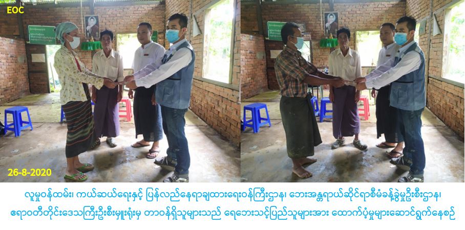 လူမှုဝန်ထမ်း၊ ကယ်ဆယ်ရေးနှင့် ပြန်လည်နေရာချထားရေးဝန်ကြီးဌာန၊ ဘေးအန္တရာယ်ဆိုင်ရာစီမံခန့်ခွဲမှုဦးစီးဌာန၊ ဧရာဝတီတိုင်းဒေသကြီးဦးစီးမှူးရုံးမှ တာဝန်ရှိသူများသည် (၂၃-၈-၂၀၂၀) ရက်နေ့၌ ပုသိမ်ခရိုင်၊ ငပုတောမြို့နယ်၊ ငရုတ်ကောင်းမြို့၊ သစ်ရောင်းကျေးရွာအုပ်စု၊ သံပတ်ကွင်းကျေးရွာတွင် မိုးသည်းထန်စွာရွာသွန်းမှုကြောင့် တောင်ကျရေများ ဝင်ရောက်သဖြင့် ရေနောက်မျောပါ တစ်စိတ်တစ်ပိုင်းပျက်စီးခဲ့သည့် နေအိမ် (၂)လုံး၊ အိမ်ထောင်စု (၂)စုမှ လူဦးရေ (၁၅)ဦးအတွက် အိမ်ဆောက်ပစ္စည်းဖိုးထောက်ပံ့ငွေ (၁၄၀၀၀ဝ/-)ကျပ်၊ ဆန်ရိက္ခာ(၇)ရက်စာဖိုးထောက်ပံ့ငွေ (၃၁၅၀၀/-)ကျပ်၊ စုစုပေါင်း ရန်ပုံငွေ (၁၇၁၅၀၀/-)ကျပ်အား (၂၆-၈-၂၀၂၀)ရက်နေ့ (၁၀၀၀)နာရီအချိန်တွင် ဘေးသင့်ပြည်သူများ လက်ဝယ်အရောက် ကွင်းဆင်းထောက်ပံ့ပေးအပ်ခဲ့ပါကြောင်း သတင်းရရှိပါသည်။