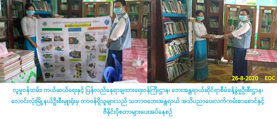 လူမှုဝန်ထမ်း၊ ကယ်ဆယ်ရေးနှင့် ပြန်လည်နေရာချထားရေးဝန်ကြီးဌာန၊ ဘေးအန္တရာယ်ဆိုင်ရာစီမံခန့်ခွဲမှုဦးစီးဌာန၊ လောင်းလုံးမြို့နယ်ဦးစီးမှူးရုံးမှ တာဝန်ရှိသူများသည် (၂၆-၈-၂၀၂၀) ရက်တွင် ပြန်ကြားရေးနှင့်ပြည်သူ့ဆက်ဆံရေးဦးစီးဌာန နှင့်အတူပူးပေါင်း၍ ထားဝယ်ခရိုင်၊ လောင်းလုံးမြို့နယ်ရှိ စာကြည့်တိုက်တွင် အများပြည်သူများ လေ့လာနိုင်ရန်အတွက် သဘာ၀ဘေးအသိပညာပေးလက်ကမ်းစာစောင်များနှင့် မြေပြိုဘေး အသိပညာပေး ဗီနိုင်းပိုစတာ (၁) ချပ် တို့အားသွားရောက် ပေးအပ်ခဲ့ပါကြောင်း သတင်းရရှိပါသည်။