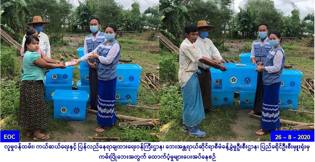 လူမှုဝန်ထမ်း၊ ကယ်ဆယ်ရေးနှင့် ပြန်လည်နေရာချထားရေး ဝန်ကြီးဌာန၊ ဘေးအန္တရာယ်ဆိုင်ရာစီမံခန့်ခွဲမှုဦးစီးဌာန၊ ပြည်ခရိုင် ဦးစီးမှူးရုံးမှ တာဝန်ရှိသူများသည် (၂၅-၈-၂၀၂၀)ရက်နေ့ ပြည်ခရိုင်၊ ရွှေတောင်မြို့နယ်၊ တရုတ်မှော်ကျေးရွာအုပ်စု၊ သာစည် ကျေးရွာတွင် ဖြစ်ပွားခဲ့သော ကမ်းပြိုဘေးသင့်နေအိမ် (၈)လုံးရှိ အိမ်ထောင်စု(၈)စုအား အိမ်ဆောက်ပစ္စည်းဖိုးထောက်ပံ့ငွေ (၈၀၀၀၀၀/-) ကျပ် နှင့် လူဦးရေ (၁၆) ဦးအတွက် ဆန်ရိက္ခာဖိုးထောက်ပံ့ငွေ (၃၃၆၀၀/-) ကျပ် စုစုပေါင်း (၈၃၃၆၀၀/-) ကျပ်နှင့် ကယ်ဆယ်ရေးပစ္စည်း (၁၀) မျိုးတို့အား (၂၆-၈-၂၀၂၀)ရက်နေ့ နံနက် (၁၁:၃၀) အချိန်တွင် ဘေးသင့်ပြည်သူများ လက်၀ယ်အရောက် သွားရောက် ထောက်ပံ့ခဲ့ပါကြောင်း သတင်းရရှိပါသည်။