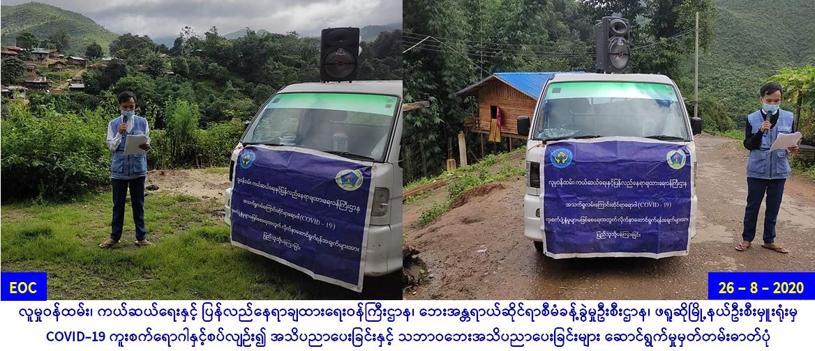 လူမှုဝန်ထမ်း၊ ကယ်ဆယ်ရေးနှင့် ပြန်လည်နေရာချထားရေး ဝန်ကြီးဌာန၊ ဘေးအန္တရာယ်ဆိုင်ရာစီမံခန့်ခွဲမှုဦးစီးဌာန၊ ဖရူဆို မြို့နယ်ဦးစီးမှူးရုံးမှ တာဝန်ရှိသူများသည် (၂၆.၈.၂၀၂၀) ရက်နေ့တွင် ဖရူဆိုမြို့နယ်၊ ဒိုးပရယ်ကျးရွာအုပ်စု၊ ဘီဆိုကျေးရွာ၊ ထီးဒူးလယ်ကျေးရွာ၊ လျားဒူကျေးရွာ၊ ထီးလျားဆိုကျေးရွာများရှိ ပြည်သူများအား COVID-19 ကူးစက်ရောဂါ ပြန့်ပွားမှု မဖြစ်ပွားစေရန်အတွက် သိရှိလိုက်နာရန်အချက်များနှင့် သဘာဝဘေးအန္တရာယ်နှင့်စပ်လျဉ်းသည့် ဆောင်ရန်၊ ရှောင်ရန်များကို အသိပညာဖြန့်ဝေပေးခဲ့ပါကြောင်း သတင်းရရှိပါသည်။