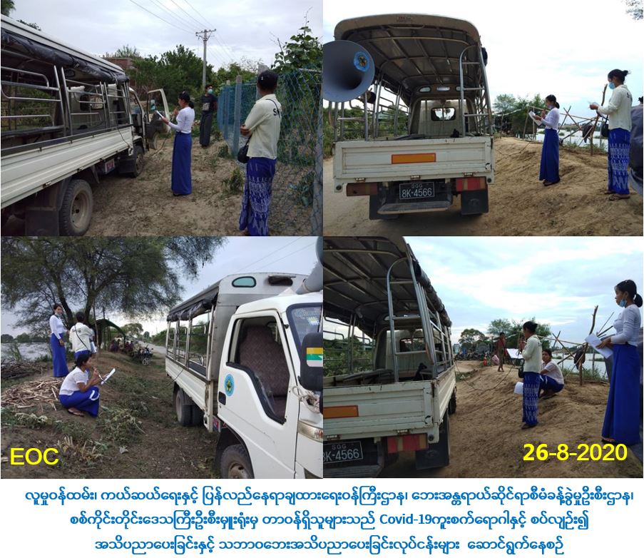 လူမှုဝန်ထမ်း၊ ကယ်ဆယ်ရေးနှင့် ပြန်လည်နေရာချထားရေးဝန်ကြီးဌာန၊ ဘေးအန္တရာယ် ဆိုင်ရာစီမံခန့်ခွဲမှုဦးစီးဌာန၊ စစ်ကိုင်းတိုင်းဒေသကြီးဦးစီးမှူးရုံးမှ တာဝန်ရှိသူများသည် (၂၆-၈-၂၀၂၀) ရက်နေ့တွင် စစ်ကိုင်းတိုင်းဒေသကြီး၊ မုံရွာမြို့နယ်အတွင်းရှိ မရိုးကုန်းကျေးရွာ၊ သစ်ဆိမ့်ကျေးရွာ၊ ချမ်းသာကျွန်းကျေးရွာ၊ နဂါးတွင်းကျေးရွာနှင့် မောင်ကြီးတို့ရွာ ကျေးရွာ များတွင် ရေဘေးအန္တရာယ်နှင့် ပတ်သက်၍ အသိပညာပေးခြင်းနှင့် covid-19 ရောဂါနှင့် ပတ်သက်၍ ဆောင်ရန်/ရှောင်ရန်များအား အသိပညာပေးခြင်းလုပ်ငန်းများကို ဆောင်ရွက်ခဲ့ ကြောင်း သတင်းရရှိပါသည်။
