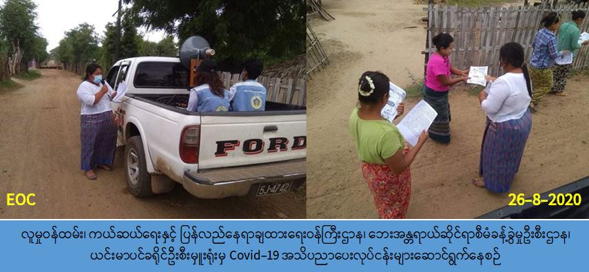 လူမှုဝန်ထမ်း၊ ကယ်ဆယ်ရေးနှင့် ပြန်လည်နေရာချထားရေးဝန်ကြီးဌာန၊ ဘေးအန္တရာယ်ဆိုင်ရာ စီမံခန့်ခွဲမှုဦးစီးဌာန၊ ယင်းမာပင်ခရိုင်ဦးစီးမှူးရုံးမှ တာဝန်ရှိသူများသည် (၂၆-၈-၂၀၂၀) ရက်နေ့ တွင် ဆားလင်းကြီးမြို့နယ်တွင် မြို့ပေါ်ရပ်ကွက် (၃) ရပ်ကွက်၊ မြေဇွန်း၊ ရွာသစ်၊ ဘုတ်စုရွာ၊ ရင်ပေါင်တိုင်၊ သဌေးကုန်း၊ ၊ မင်းတော၊ ငွေသာအရှေ့၊ ငွေသာအနောက်၊ ရေမိန်တောင်ရွာ၊ ရေမိန်မြောက်ရွာ၊ စူဠာကျေးရွာများတွင် COID-19 ရောဂါနှင့် ပတ်သတ်၍ အသိပေးနှိုးဆော်ခြင်း လုပ်ငန်းများ ဆောင်ရွက်ခဲ့ပါကြောင်း သတင်းရရှိပါသည်။