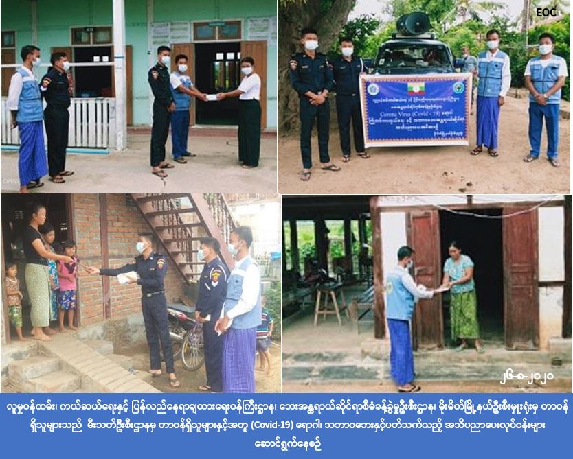 လူမှုဝန်ထမ်း၊ ကယ်ဆယ်ရေးနှင့် ပြန်လည်နေရာချထားရေးဝန်ကြီးဌာန၊ ဘေးအန္တရာယ်ဆိုင်ရာစီမံခန့်ခွဲမှုဦးစီးဌာန၊ မိုးမိတ်မြို့နယ်ဦးစီးမှူးရုံးမှ တာဝန်ရှိသူများသည် (၂၆-၈-၂၀၂၀) ရက်နေ့တွင် မီးသတ်ဦးစီးဌာနနှင့် ပူးပေါင်း၍ မိုးမိတ်မြို့နယ်၊ သစ်ဆိမ့်ကုန်းကျေးရွာအုပ်စု၊နဘူးကျေးရွာ၊ ကင်းချောင်းကျေးရွာ၊ ပေကုန်းကျေးရွာ၊ ကျောက်မော ကျေးရွာ၊အောင်မြေကျေးရွာ၊ ဝဲပေါင်းကျေးရွာနှင့် သစ်ဆိမ့်ကုန်းကျေးရွာတို့တွင် Covid-19 ဒုတိယလှိုင်းကာလ အတွင်း ပြည်သူများ နေထိုင်ရမည့် ကျန်းမာရေးအမူအကျင့်များ အသိပညာပေးဟောပြောခြင်း၊ အခြားသော သဘာဝဘေးများနှင့်ပတ်သက်သည့် ဆောင်ရန်/ရှောင်ရန်များကို ကျေးရွာနေ ပြည်သူတို့အား အသိပညာပေး အစီအစဉ်ကို အသံချဲ့စက်အသုံးပြု၍ဟောပြောခြင်း၊ နှာခေါင်းစည်း (Mask)များဖြန့်ဝေခြင်းနှင့် လက်ကမ်း စာစောင်များဖြန့်ဝေခြင်းတို့ကို ဆောင်ရွက်ခဲ့ကြောင်း သိရှိရပါသည်။