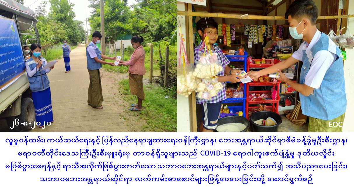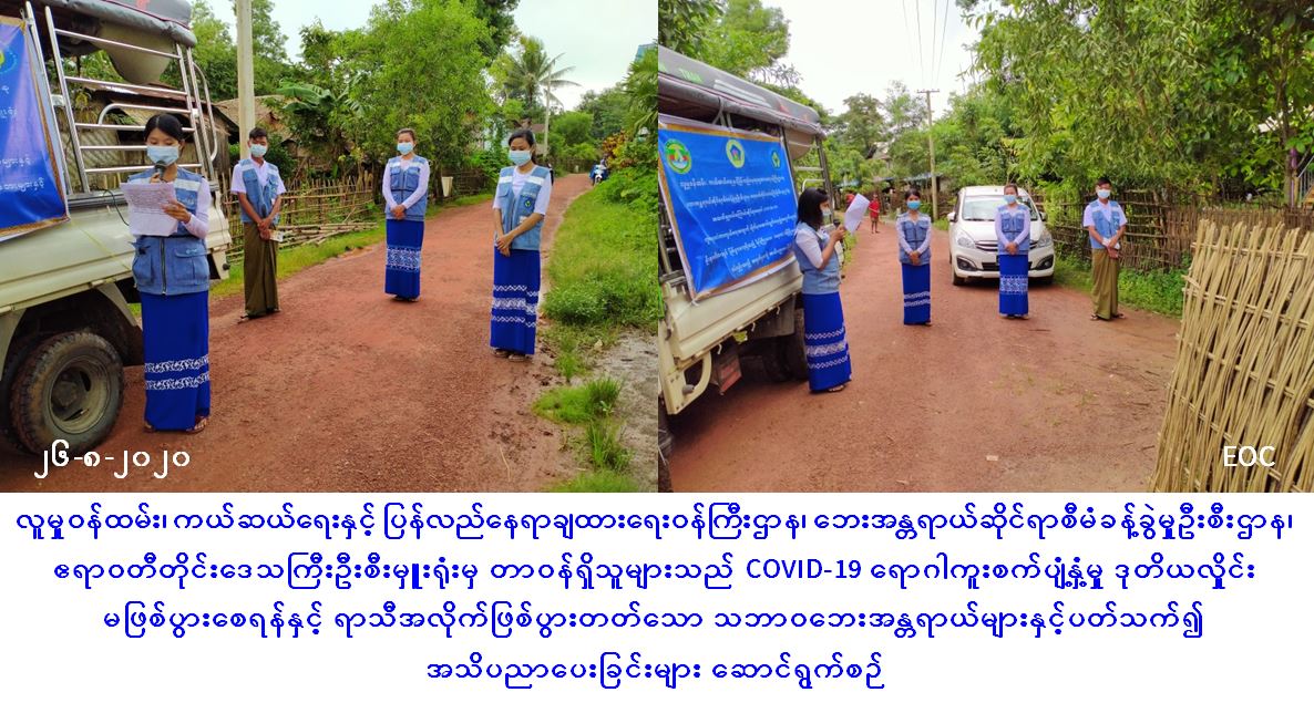 လူမှုဝန်ထမ်း၊ ကယ်ဆယ်ရေးနှင့် ပြန်လည်နေရာချထားရေးဝန်ကြီးဌာန၊ ဘေးအန္တရာယ်ဆိုင်ရာစီမံခန့်ခွဲမှုဦးစီးဌာန၊ ဧရာဝတီတိုင်းဒေသကြီးဦးစီးမှူးရုံးမှ တာဝန်ရှိသူများသည် (၂၆-၈-၂၀၂၀) ရက်နေ့၊ (ဝ၉:၀၀) နာရီအချိန်မှစ၍ ပုသိမ်ခရိုင်၊ ကန်ကြီးထောင့်မြို့နယ်၊ မဂူကျွန်းကျေးရွာအုပ်စု မဂူကျွန်းကျေးရွာ၊ မိချောင်းတစ်ရာကျေးရွာအုပ်စု မိချောင်းတစ်ရာကျေးရွာ၊ ဘဲဂရက်ကြီးကျေးရွာနှင့် ရွာသစ်ကုန်းကျေးရွာတို့တွင် ကျန်းမာရေးနှင့်အားကစားဝန်ကြီးဌာနမှ ထုတ်ပြန်ထားသော Covid-19 ကူးစက်ရောဂါ ဒုတိယလှိုင်း ဖြစ်ပွားစေရေးပြည်သူသို့ပန်ကြားချက်နှင့် ဧရာဝတီတိုင်းဒေသကြီး Covid-19 ထိန်းချုပ်ရေးနှင့် အရေးပေါ်တုံ့ပြန်ရေးကော်မတီမှ ထုတ်ပြန်ပြီးဖြစ်သည့် တားမြစ်မိန့်နှင့်ညွှန်ကြားချက်များအားလည်းကောင်း၊ ရာသီအလိုက်ဖြစ်ပွားတတ်သော သဘာဝဘေးအန္တရာယ်များနှင့်ပတ်သက်၍ အသိပညာပေးခြင်း၊ သဘာဝဘေးအန္တရာယ်ဆိုင်ရာ လက်ကမ်းစာစောင်များဖြန့်ဝေပေးခြင်းတို့အားလည်းကောင်း အများပြည်သူများသိရှိလိုက်နာရန် အသိပညာပေးလုပ်ငန်းများ ပြုလုပ်ဆောင်ရွက်ခဲ့ကြောင်း သတင်းရရှိပါသည်။