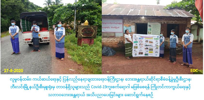 လူမှုဝန်ထမ်း၊ ကယ်ဆယ်ရေးနှင့် ပြန်လည်နေရာချထားရေးဝန်ကြီးဌာန၊ ဘေးအန္တရာယ်ဆိုင်ရာစီမံခန့်ခွဲမှုဦးစီးဌာန၊ ဘီးလင်းမြို့နယ်ဦးစီးမှူးရုံးမှ တာဝန်ရှိသူများသည် (၂၇-၉-၂၀၂၀) ရက်နေ့၊ (၀၈:၃၀) နာရီအချိန်မှ (၁၂:၃၀) နာရီအချိန်ထိ မွန်ပြည်နယ်၊ သထုံခရိုင်၊ ဘီးလင်းမြို့နယ် ၊သိမ်ငူကျေးရွာအုပ်စုအတွင်းရှိ သိမ်ငူကျေးရွာနှင့်ဆင်အင်းကျေးရွာအုပ်စုအတွင်းရှိ ဆင်အင်းကျေးရွာ၊ ဆပ်သွားကျေးရွာ၊ ကျီးပင်ကျေးရွာ၊ အင်းဖလောင်းကျေးရွာနှင် ညောင်သာယာကျေးရွာတို့တွင် Covid-19 ရောဂါကူးစက်ပျံ့နှံ့မှုများ မဖြစ်ပွားစေရေးနှင့် မိုးရာသီကာလအတွင်း ဖြစ်ပွားလေ့ရှိသည့် မိုးကြိုးဘေး၊ မုန်တိုင်းဘေး၊ ရေဘေးနှင့် မြေပြိုဘေးအန္တရာယ်များ ကြိုတင်ပြင်ဆင်ရေး အသိပညာပေးခြင်းများ ဆောင်ရွက်ခဲ့ပါကြောင်း သတင်းရရှိပါသည်။