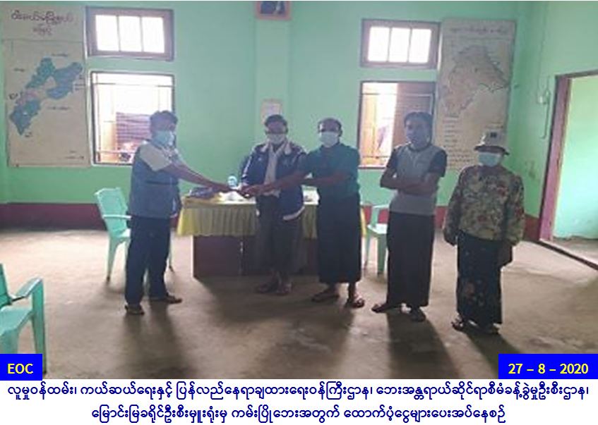 လူမှုဝန်ထမ်း၊ ကယ်ဆယ်ရေးနှင့် ပြန်လည်နေရာချထားရေး ဝန်ကြီးဌာန၊ ဘေးအန္တရာယ်ဆိုင်ရာစီမံခန့်ခွဲမှုဦးစီးဌာန၊ မြောင်းမြ ခရိုင်ဦးစီးမှူးရုံးမှ တာဝန်ရှိသူများသည် (၂၅-၈-၂၀၂၀)ရက်နေ့၌ မြောင်းမြခရိုင်၊ ဝါးခယ်မမြို့နယ်၊ ကမ်းပြိုကျေးရွာအုပ်စု၊ ရေကျော်ကျေးရွာတွင် ဖြစ်ပွားခဲ့သော ကမ်းပြိုဘေးကြောင့် ကြိုတင်ရွှေ့ပြောင်းခဲ့ရသော အိမ်ထောင်စု(၃)စု၊ လူဦးရေ(၁၁)ဦးတို့ အတွက် အိမ်ဆောက်ပစ္စည်းရန်ပုံငွေ(၃၀၀၀၀ဝ/-)ကျပ်၊ ဆန်ရိက္ခာရန်ပုံငွေ(၂၃၁၀ဝ/-)ကျပ်၊ စုစုပေါင်းရန်ပုံငွေ (၃၂၃၁၀ဝ/-) ကျပ်အား (၂၇-၈-၂၀၂၀)ရက်နေ့၊ (၁၃:၀၀)နာရီအချိန်တွင် ရွှေလောင်မြို့အုပ်ချုပ်ရေးမှူးရုံးတွင် ဘေးသင့်ပြည်သူများထံ သွားရောက်ထောက်ပံ့ပေးအပ်ခဲ့ပါကြောင်း သတင်းရရှိပါသည်။