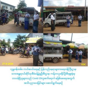 လူမှုဝန်ထမ်း၊ ကယ်ဆယ်ရေးနှင့် ပြန်လည်နေရာချထားရေးဝန်ကြီးဌာန၊ ဘေးအန္တရာယ်ဆိုင်ရာစီမံခန့်ခွဲမှုဦးစီးဌာန၊ ကန့်ဘလူခရိုင်ဦးစီးမှူးရုံးမှ တာဝန်ရှိသူများသည် (၂၇-၈-၂၀၂၀) ရက်နေ့၊ (၀၈:၀၀)နာရီအချိန်မှ (၁၂:၀၀)နာရီအချိန်ထိ ကန့်ဘလူမြို့နယ်၊ဇီးကုန်းမြို့ ပေါ်ရှိ ရန်ကြီးအောင်ရပ်ကွက်၊ ရန်နိုင်အေးရပ်ကွက်၊ လက်ဆည်ရပ်ကွက်၊ နဂါးပေါ်ရပ်ကွက်၊ အောင်သိဒ္ဓိရပ်ကွက်၊ ချမ်းအေးသာယာရပ်ကွက်တို့တွင် COVID-19 ရောဂါ ကူးစက်ပျံ့နှံ့မှု မဖြစ်ပွားစေရေးအတွက် သိရှိပြီး လိုက်နာ ဆောင်ရွက်ရန်အချက်များကို ကန့်ဘလူခရိုင်ပြန်ကြားရေးနှင့်ပြည်သူ့ဆက်ဆံရေးဦးစီးဌာနတို့နှင့်ပူးပေါင်း၍ အသိပေးနှိုးဆော်ခြင်းများ ဆောင်ရွက်ခဲ့ပါကြောင်း သတင်းရရှိပါသည်။