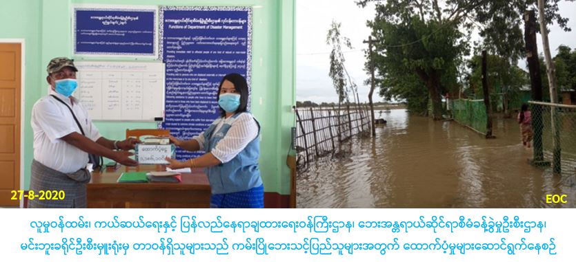 လူမှုဝန်ထမ်း၊ ကယ်ဆယ်ရေးနှင့် ပြန်လည်နေရာချထားရေးဝန်ကြီးဌာန၊ ဘေးအန္တရာယ်ဆိုင်ရာစီမံခန့်ခွဲမှုဦးစီးဌာန၊ မင်းဘူးခရိုင်ဦးစီးမှူးရုံးမှ တာဝန်ရှိသူများသည် (၂၃-၈-၂၀၂၀) ရက်နေ့၌ မင်းဘူးခရိုင်၊ မင်းဘူး(စကု)မြို့နယ်၊ နိဗ္ဗာန်ကျွန်းကျေးရွာ နှင့် ကျောင်းကုန်းကျေးရွာတို့တွင် ဖြစ်ပွားခဲ့သော ဧရာဝတီမြစ်ရေတိုက်စား၍ ကမ်းပါးပြိုကျမည်ကို စိုးရိမ်မှုကြောင့် ကြိုတင်ပြောင်းရွှေ့အိမ်ခြေ(၁၁)လုံး၊ အိမ်ထောင်စု(၁၁)စုတို့အတွက် အိမ်ဆောက်ပစ္စည်းဖိုးထောက်ပံ့ငွေ(၁,၁၀၀,၀၀၀/-)ကျပ်၊ လူဦးရေ (၄၁)ဦးအတွက် ဆန်ရိက္ခါ(၇)ရက်စာဖိုးထောက်ပံ့ငွေ (၈၆,၁၀၀/-)ကျပ်၊ စုစုပေါင်းထောက်ပံ့ငွေ(၁,၁၈၆,၁၀၀/-)ကျပ်အား (၂၇-၈-၂၀၂၀)ရက်နေ့၊ (၁၄:၀၀)အချိန်တွင် ကျေးရွာအုပ်စုအုပ်ချုပ်ရေးမှူးများထံသို့ လွှဲပြောင်းထောက်ပံ့ပေးအပ်ခဲ့ပါကြောင်း သတင်းရရှိပါသည်။