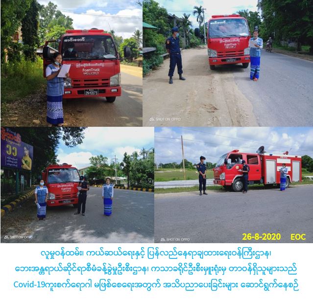 လူမှုဝန်ထမ်း၊ ကယ်ဆယ်ရေးနှင့် ပြန်လည်နေရာချထားရေးဝန်ကြီးဌာန၊ ဘေးအန္တရာယ်ဆိုင်ရာစီမံခန့်ခွဲမှုဦးစီးဌာန၊ ကသာခရိုင်ဦးစီးမှူးရုံးမှ တာဝန်ရှိသူများသည် (၂၆-၈-၂၀၂၀)ရက်နေ့၊ (၀၉:၀၀) နာရီအချိန်မှ (၁၅:၀၀) ကသာခရိုင်၊ အင်းတော်မြို့နယ်၊ အောင်မေတ္တာရပ်ကွက်၊ အောင်ချမ်းသာရပ်ကွက်၊ အောင်ဇေယျရပ်ကွက်၊ အောင်မင်္ဂလာရပ်ကွက်၊ စင့်ဟောက်ကျေးရွာ၊ အင်းရွာကျေးရွာ၊ ကြာအင်းကျေးရွာ၊ နန့်ခင့်ကျေးရွာ၊ နားခါကျေးရွာ၊ လယ်ပ့င်ကျေးရွာတို့တွင် မော်တော်ကားဖြင့် အသံချဲ့စက်၊ လော်စပီကာများ တင်ဆောင်ကာ Covid-19 ကြိုတင်ကာကွယ် ထိန်းချုပ်နိုင်ရန် ပြည်သူသို့ အသိပညာပေး ပန်ကြားချက်များအား လှည့်လည်ကြေညာခြင်းများ ဆောင်ရွက်ခဲ့ပါကြောင်း သတင်းရရှိပါသည်။