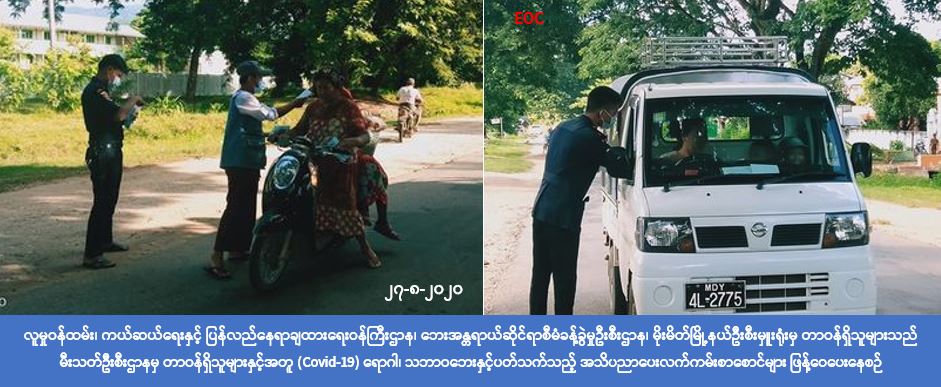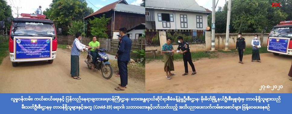 လူမှုဝန်ထမ်း၊ ကယ်ဆယ်ရေးနှင့် ပြန်လည်နေရာချထားရေးဝန်ကြီးဌာန၊ ဘေးအန္တရာယ်ဆိုင်ရာစီမံခန့်ခွဲမှုဦးစီးဌာန၊ မိုးမိတ်မြို့နယ်ဦးစီးမှူးရုံးမှ တာဝန်ရှိသူများသည် (၂၇-၈-၂၀၂၀) ရက်နေ့တွင် မီးသတ်ဦးစီးဌာနနှင့် ပူးပေါင်း၍ မိုးမိတ်မြို့နယ်၊ တောင်ကိုင်းအုပ်စု၊ ညောင်ပင်စောက် ကျေးရွာ၊ ဒိုးပင်ကျေးရွာနှင့် တောင်ကိုင်းကျေးရွာတို့တွင် (Covid-19) ရောဂါ ကူးစက်မှုမဖြစ်ပွားစေရန် ပြည်သူများနေထိုင်ရမည့် ကျန်းမာရေးအမူအကျင့်များ အသိပညာ ပေးဟောပြောခြင်း၊ အခြားသောသဘာဝဘေးများနှင့်ပတ်သက်သည့် ဆောင်ရန်/ ရှောင်ရန်များကို ကျေးရွာနေ ပြည်သူတို့အား အသိပညာပေးအစီအစဉ်ကို အသံချဲ့စက်အသုံးပြု၍ဟောပြောခြင်း၊ နှာခေါင်းစည်း (Mask)များ ဖြန့်ဝေခြင်းနှင့် လက်ကမ်းစာစောင်များဖြန့်ဝေခြင်းတို့ ဆောင်ရွက်ခဲ့ကြောင်း သိရှိရပါသည်။