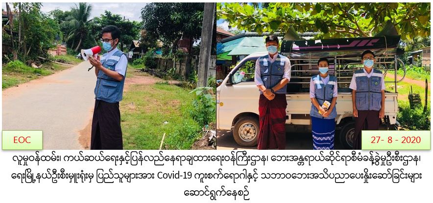 လူမှုဝန်ထမ်း၊ ကယ်ဆယ်ရေးနှင့်ပြန်လည်နေရာချထားရေးဝန်ကြီးဌာန၊ ဘေးအန္တရာယ်ဆိုင်ရာစီမံခန့်ခွဲမှုဉီးစီးဌာန၊ ရေးမြို့နယ်ဦးစီးမှူးရုံးမှ တာဝန်ရှိသူများသည် (၂၇-၈-၂၀၂၀) ရက်နေ့ (၁၀:၀၀) နာရီအချိန်မှ (၁၄:၀၀) နာရီအချိန်အထိ မွန်ပြည်နယ်၊ မော်လမြိုင်ခရိုင်၊ ရေးမြို့နယ်၊ သီရိခေမာရပ်ကွက်၊ သီရိမာလာရပ်ကွပ်နှင့် သီရိဇေယျာရပ်ကွက်တို့တွင် COVID-19 ရောဂါကူးစက်ပြန့်နှံ့မှု မဖြစ်ပွားစေရေးနှင့် မိုးရာသီကာလအတွင်းဖြစ်ပွားလေ့ရှိသည့် မိုးကြိုးဘေး၊ မုန်တိုင်းဘေး၊ ရေဘေး၊ မြေပြိုဘေးအန္တရာယ်များ ကြိုတင်ပြင်ဆင်ရေးအသိပညာပေးခြင်းနှင့် လက်ကမ်းစာစောင်များဖြန့်ဝေခြင်းများ ဆောင်ရွက်ခဲ့ကြောင်း သတင်းရရှိပါသည်။