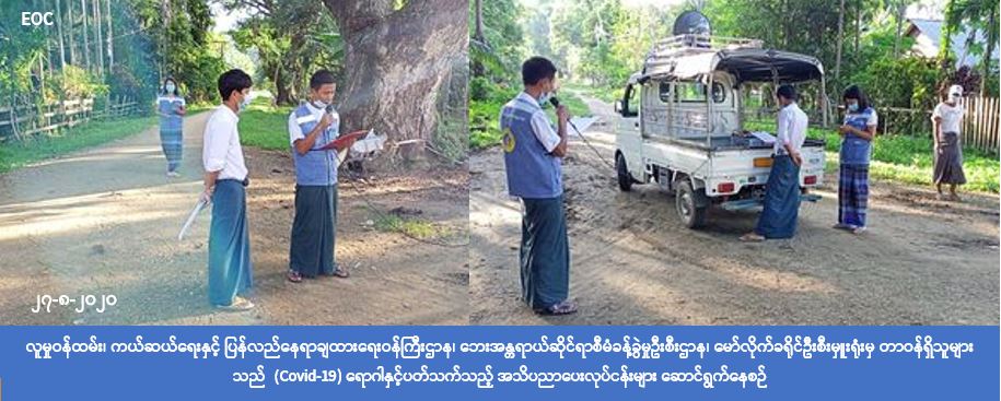 လူမှုဝန်ထမ်း၊ ကယ်ဆယ်ရေးနှင့် ပြန်လည်နေရာချထားရေးဝန်ကြီးဌာန၊ ဘေးအန္တရာယ်ဆိုင်ရာစီမံခန့်ခွဲမှုဦးစီးဌာန၊ မော်လိုက်ခရိုင်ဦးစီးမှူးရုံးမှ တာဝန်ရှိသူများသည် (COVID-19) ကူးစက်ရောဂါ ဒုတိယလှိုင်း မဖြစ်ပေါ်စေရေးအတွက် အသိပညာပေးခြင်းလုပ်ငန်းများကို (၂၇-၈-၂၀၂၀)ရက်နေ့တွင် မော်လိုက်မြို့ပေါ်ရပ်ကွက်များဖြစ်သော သရက် ကုန်းရပ်ကွက်၊ အောင်ဇေယျာရပ်ကွက်၊ အောင်မင်္ဂလာရပ်ကွက်၊ စွယ်တော်ရပ်ကွက်၊ ကျောင်းတောင် ရပ်ကွက်၊ ကျောင်းမြောက်ရပ်ကွက်၊ တံတားဦးရပ်ကွက်၊ ညောင်ပင်သာရပ်ကွက်စသည့် ရပ်ကွက်များတွင် အသိပညာပေး လှည့်လည်နှိုးဆော်ခဲ့ကြောင်း သိရှိရပါသည်။