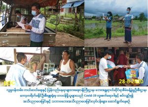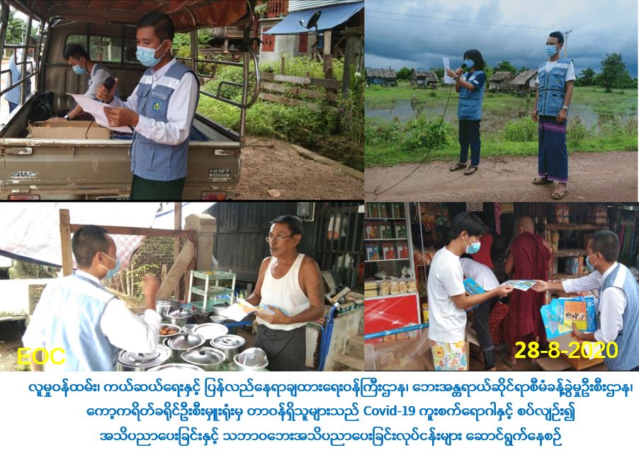 လူမှုဝန်ထမ်း၊ ကယ်ဆယ်ရေးနှင့် ပြန်လည်နေရာချထားရေးဝန်ကြီးဌာန၊ ဘေးအန္တရာယ် ဆိုင်ရာစီမံခန့်ခွဲမှုဦးစီးဌာန၊ ကော့ကရိတ်ခရိုင်ဦးစီးမှူးရုံးမှ တာဝန်ရှိသူများသည် (၂၈-၈-၂၀၂၀) ရက်နေ့၊ နံနက် (၀၈:၀၀) နာရီချိန်မှ နေ့လည်(၁၂:၀၀) နာရီအချိန်ထိ ကြာအင်းဆိပ်ကြီးမြို့နယ်၊ ကြာအင်းရွှေဒိုးကျေးရွာအုပ်စုအတွင်းရှိ ကြာအင်းကျေးရွာ၊ ရွှေဒိုးကျေးရွာနှင့် တဂေးကျေးရွာတို့၌ Covid-19 ကူးစက်မြန်ရောဂါပြန့်ပွားမှုများ မဖြစ်ပွား စေရန်အတွက် သိရှိလိုက်နာရမည့် အချက်များနှင့် မိုးရာသီကာလအတွင်း ဖြစ်ပွားတက်သော သဘာဝဘေးအန္တရာယ်များနှင့်စပ်လျဥ်း၍ ဆောင်ရန်/ရှောင်ရန် အချက်များအား အသံချဲ့စက် ဖြင့် ပြည်သူလူထုအတွင်း အသိပညာပေးဆောင်ရွက်ခဲ့ပြီး လက်ကမ်းစာစောင်များလည်း ဖြန့်ဝေပေးခဲ့ကြောင်း သတင်းရရှိပါသည်။