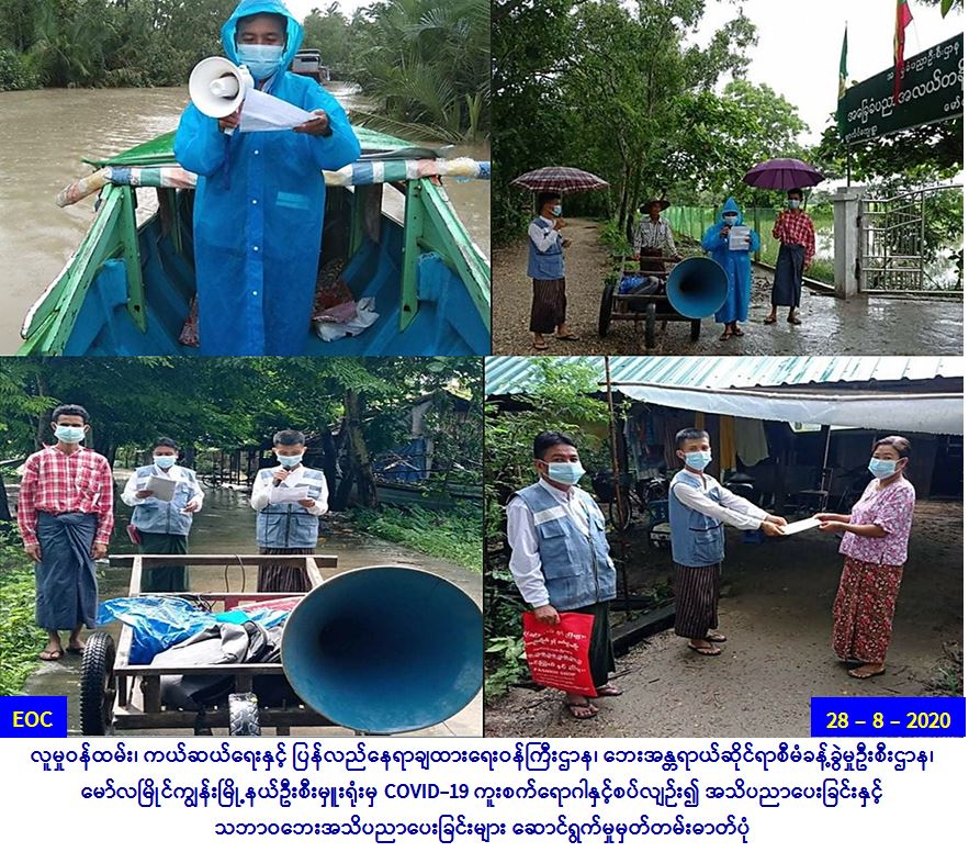 လူမှုဝန်ထမ်း၊ ကယ်ဆယ်ရေးနှင့် ပြန်လည်နေရာချထားရေး ဝန်ကြီးဌာန၊ ဘေးအန္တရာယ်ဆိုင်ရာစီမံခန့်ခွဲမှုဦးစီးဌာန၊ မော်လမြိုင်ကျွန်းမြို့နယ်ဦးစီးမှူးရုံးမှ တာဝန်ရှိသူများသည် အထွေထွေအုပ်ချုပ်ရေးဦးစီးဌာနနှင့်အတူပူးပေါင်း၍ (၂၈-၈-၂၀၂၀) ရက်နေ့၊ (၀၉:၀၀) နာရီအချိန်မှ (၁၃:၀၀) နာရီအချိန်ထိ မော်လမြိုင်ကျွန်းမြို့နယ်၊ မြစ်ကြီးဘိုးကျေးရွာအုပ်စုအတွင်းရှိ ဘိုးပန်း လှကျေးရွာ၊ ဂွေးချောင်းကျေးရွာ၊ အနန်းချောင်းကျေးရွာ၊ ဖောင်ကွဲကျေးရွာ၊ မဂူချောင်းကျေးရွာ၊ ကဇောင်းဝကျေးရွာ၊ ကဇောင်း ဖျားကျေးရွာ၊ မြစ်ကြီးဘိုးကျေးရွာနှင့် ကနစိုချောင်းကျေးရွာတို့အတွင်း Covid-19 ကူးစက်မှု ဒုတိယလှိုင်းမဖြစ်ပွားစေရန်အတွက် အများပြည်သူများ သိရှိလိုက်နာရန်အချက်များအား ကွင်းဆင်း၍ ကျန်းမာရေးနှင့်အားကစားဝန်ကြီးဌာနမှ ထုတ်ပြန်ထားသော အသိပေးကြေငြာချက်များ၊ မိုးရွာသီတွင်ဖြစ်ပွားတတ်သော မိုးကြိုးဘေး၊ မုန်တိုင်းဘေး၊ ရေဘေး အန္တရာယ်အသိပညာပေး ခြင်းနှင့် လက်ကမ်းစာစောင်ဝေငှခြင်းများကို အများပြည်သူတို့ သိရှိလိုက်နာနိုင်စေရန် ကွင်းဆင်းလှည့်လည်၍ Hand Speaker၊ Loud Speaker များဖြင့် အသိပညာပေးလုပ်ငန်းများ ဆောင်ရွက်ခဲ့ပါကြောင်း သတင်းရရှိပါသည်။