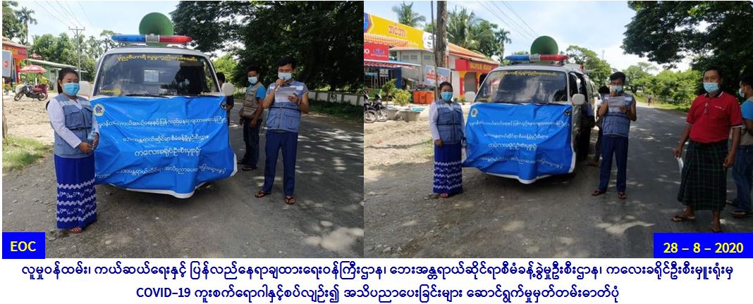 လူမှုဝန်ထမ်း၊ ကယ်ဆယ်ရေးနှင့် ပြန်လည်နေရာချထားရေး ဝန်ကြီးဌာန၊ ဘေးအန္တရာယ်ဆိုင်ရာစီမံခန့်ခွဲမှုဦးစီးဌာန၊ ကလေး ခရိုင်ဦးစီးမှူးရုံးမှ တာဝန်ရှိသူများသည် (၂၈-၈-၂၀၂၀)ရက်နေ့၊ (၀၈:၀၀)နာရီမှ (၁၂:၀၀)နာရီအထိ လူမှုရေးအသင်းအဖွဲ့များ၊ Volunteer အဖွဲ့ဝင်များနှင့်အတူပူးပေါင်း၍ ကလေးမြို့နယ်ရှိ ချင်းဆိုင်ရွာ၊ သာစည်ရွာ၊ ဇင်းကလင်းရွာ၊ သာယာဝတီရွာ၊ သာယာကုန်ရွာ၊ ကြာအင်းရွာ၊ ထောက်ကြံ့ရွာ၊ စည်သာရွာ၊ နတ်ချောင်းရွာ၊ နတ်မြောင်းရွာများရှိ ပြည်သူများအား Covid-19 ရောဂါကူးစက်မှုမဖြစ်ပွားစေရန် အသိပညာပေးလုပ်ငန်းများ ဆောင်ရွက်ခဲ့ပါကြောင်း သတင်းရရှိပါသည်။