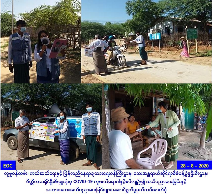 လူမှုဝန်ထမ်း၊ ကယ်ဆယ်ရေးနှင့် ပြန်လည်နေရာချထားရေး ဝန်ကြီး ဌာန၊ မိတ္ထီလာခရိုင်ဦးစီးမှူးရုံးမှ တာဝန်ရှိသူများသည်ယနေ့ သြဂုတ်လ ၂၈ ရက်နေ့တွင် မိတ္ထီလာမြို့နယ်အတွင်းရှိသီးကုန်းကျေးရွာအုပ်စု၊ မုန်တိုင်ကျေးရွာအုပ်စု၊ သရက်ပင်ကျေးရွာ အုပ်စုအောက်ရှိ ကျေးရွာများသို့သွားရောက်ကာ ကျေးရွာရှိပြည်သူများအား Covid-19 ရောဂါကူးစက်မှု ဒုတိယလှိုင်းမ ဖြစ်ပွားစေရန်အသိပညာပေးခြင်းနှင့် သဘာဝဘေးအန္တရာယ်ကြိုတင်ကာကွယ်ရေးအသိပညာပေး လှုံ့ဆော်ခြင်း၊ ပိုစတာများ၊ လက်ကမ်း စာစောင်များ ဖြန့်ဝေခြင်းတို့ကို ဆောင်ရွက်ခဲ့ပါကြောင်း သတင်းရရှိပါသည်။