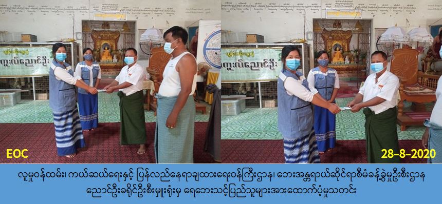 လူမှုဝန်ထမ်း၊ ကယ်ဆယ်ရေးနှင့်ပြန်လည်နေရာချထားရေးဝန်ကြီးဌာန၊ ဘေးအန္တရာယ်ဆိုင်ရာ စီမံခန့်ခွဲမှုဦးစီးဌာန၊ ညောင်ဦးခရိုင်ဦးစီးမှူးရုံးမှ တာဝန်ရှိသူများသည် (၂၇-၈-၂၀၂၀) ရက်နေ့ တွင် ညောင်ဦးမြို့ အမှတ် (၂) ရပ်ကွက်အတွင်း ဧရာဝတီမြစ်ရေ ဝင်ရောက်မှုကြောင့် ယာယီရေဘေးရှောင်စခန်းများသို့ ပြောင်းရွှေ့ နေရာချထားရသော အိမ်ထောင်စု (၅) စုမှ လူဦးရေ (၄၈) ဦးတို့ အတွက် ဆန်ရိက္ခာဖိုး (၇) ရက်စာထောက်ပံ့ငွေ (၁၀၀,၈၀၀/-) ကျပ်ကို (၂၈-၈-၂၀၂၀) ရက်နေ့ (၁၆:၀၀) အချိန်တွင် ဘေးသင့်ပြည်သူများ၏ လက်ဝယ်အရောက် ထောက်ပံ့ခဲ့ပါကြောင်းသတင်းရရှိပါသည်။