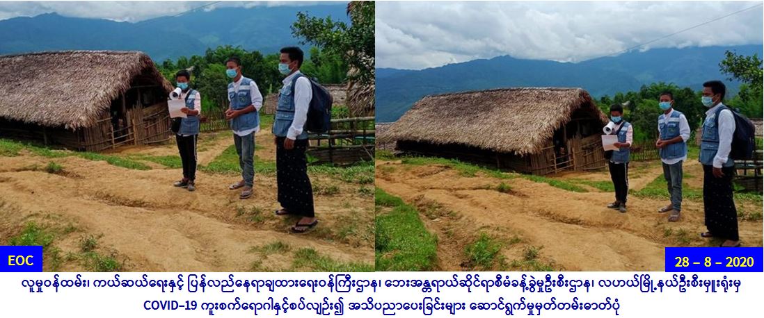 လူမှုဝန်ထမ်း၊ ကယ်ဆယ်ရေးနှင့် ပြန်လည်နေရာချထားရေး ဝန်ကြီးဌာန၊ ဘေးအန္တရာယ်ဆိုင်ရာစီမံခန့်ခွဲမှုဦးစီးဌာန၊ လဟယ် မြို့နယ်ဦးစီးမှူးရုံးမှ တာဝန်ရှိသူများသည် (၂၈.၈.၂၀၂၀) ရက်နေ့တွင် လဟယ်မြို့နယ်၊ စံပြကျေးရွာရှိ ပြည်သူများအား COVID-19 ရောဂါကူးစက်မှု မဖြစ်ပွားစေရန် အသိပညာပေးခြင်းများ ဆောင်ရွက်ခဲ့ပါကြောင်း သတင်းရရှိပါသည်။