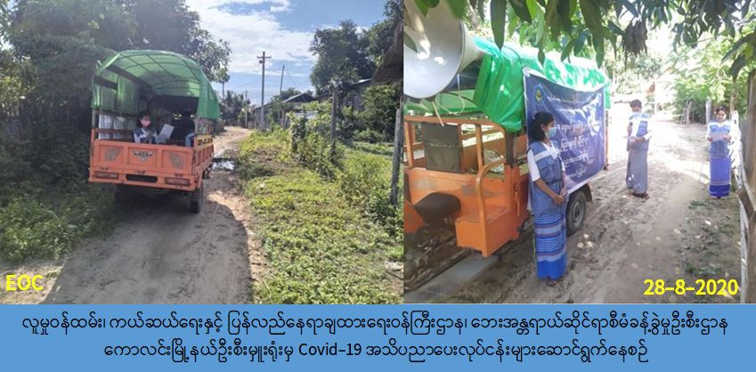 လူမှု၀န်ထမ်း၊ ကယ်ဆယ်ရေးနှင့်ပြန်လည်နေရာချထားရေး၀န်ကြီးဌာန၊ ဘေးအန္တရာယ်ဆိုင်ရာ စီမံခန့်ခွဲမှုဦးစီးဌာန၊ ကောလင်းမြို့နယ်ဦးစီးမှူးရုံး မှ(၂၈-၈-၂၀၂၀) ရက်နေ့တွင် ကောလင်း မြို့နယ်၊ မြေနီ၊ ညောင်ကိုင်း၊ ညောင်ဇင်၊ တံစူး၊ အင်ပင်သာကျေးရွာများရှိ ပြည်သူများသို့ Covid-19 ကူးစက်ရောဂါနှင့်ပတ်သတ်၍ ဆောင်ရန်၊ ရှောင်ရန်များကို လှည့်လည်၍ အသိပညာပေး ကြေညာခြင်းလုပ်ငန်း ဆောင်ရွက်ခဲ့ပါကြောင်းသတင်းရရှိပါသည်။