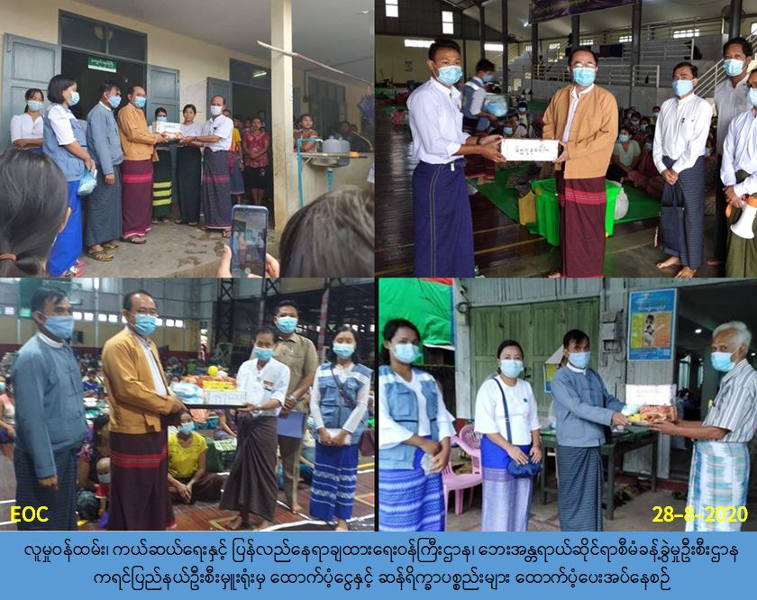 လူမှု၀န်ထမ်း၊ ကယ်ဆယ်ရေးနှင့်ပြန်လည်နေရာချထားရေး၀န်ကြီးဌာန၊ ဘေးအန္တရာယ်ဆိုင်ရာ စီမံခန့်ခွဲမှုဦးစီးဌာန၊ ကရင်ပြည်နယ်ဦးစီးမှူးရုံးမှ တာဝန်ရှိသူများသည် (၂၈-၇-၂၀၂၀)ရက်နေ့၊ (၁၅:၀၀)နာရီချိန်တွင် ကရင်ပြည်နယ်၊ ဘားအံမြို့ရှိ ကယ်ဆယ်ရေးစခန်း(၈) ခုတွင် ရေဘေး ရှောင်အိမ်ထောင်စု (၄၈၉) စု လူဦးရေ(၂၃၀၄) ဦးတို့အတွက် ဆန်ရိက္ခာ (၇)ရက်စာဖိုးထောက်ပံ့ ငွေ (၄,၈၃၈,၄၀၀/-) ကျပ်၊ surgical mask(၂၃၀၄) ခု၊ ဂေါ်ဇီလာဆပ်ပြာ(၄၈၉) တောင့်နှင့် ခေါက်ဆွဲခြောက်(၄၈၉၀) ထုပ်တို့ကို ကရင်ပြည်နယ် လူမှုရေးဝန်ကြီးနှင့်အတူ ပြည်သူလက်ဝယ် အရောက် သွားရောက်ထောက်ပံ့ခဲ့ပါကြောင်း သတင်းရရှိပါသည်။
