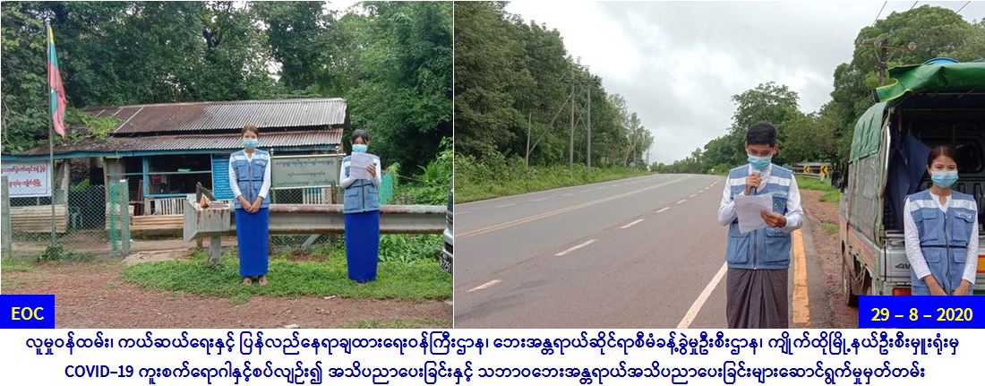 လူမှုဝန်ထမ်း၊ ကယ်ဆယ်ရေးနှင့် ပြန်လည်နေရာချထားရေး ဝန်ကြီးဌာန၊ ဘေးအန္တရာယ်ဆိုင်ရာစီမံခန့်ခွဲမှုဦးစီးဌာန၊ ကျိုက်ထို မြို့နယ်ဦးစီးမှူးရုံးမှ တာဝန်ရှိသူများသည် (၂၉-၈-၂၀၂၀)ရက်နေ့၊ (၀၉:၀၀)အချိန်မှ (၁၂:၀၀)အချိန်ထိ မွန်ပြည်နယ်၊ သထုံခရိုင်၊ ကျိုက်ထိုမြို့နယ်၊ တောင်ကလေးကျေးရွာ၊ ကွင်းကလေးကျေးရွာ၊ အင်းဝကျေးရွာနှင့် ဝင်းပြန်ကျေးရွာတို့တွင် Covid-19ရောဂါ ကူးစက်ပျံ့နှံ့မှုများမဖြစ်ပွားစေရေးနှင့် မိုးရာသီကာလအတွင်း ဖြစ်ပွားလေ့ရှိသည့် မိုးကြိုးဘေး၊ မုန်တိုင်းဘေး၊ ရေဘေး၊ မြေပြိုဘေးအန္တရာယ်များ ကြိုတင်ပြင်ဆင်ရေး အသိပညာပေးခြင်း လုပ်ငန်းအားဆောင်ရွက်ခဲ့ပါကြောင်း သတင်းရရှိပါ သည်။