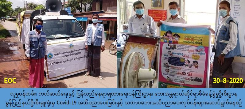 လူမှုဝန်ထမ်း၊ ကယ်ဆယ်ရေးနှင့်ပြန်လည်နေရာချထားရေးဝန်ကြီးဌာန၊ ဘေးအန္တရာယ်ဆိုင်ရာ စီမံခန့်ခွဲမှုဦးစီးဌာန၊ မွန်ပြည်နယ်ဦးစီးမှူးရုံးမှ တာဝန်ရှိသူများသည် (၃၀-၈-၂၀၂၀) ရက်နေ့ (၀၉:၀၀) နာရီအချိန်မှ (၁၁:၀၀) နာရီအချိန်အထိ မွန်ပြည်နယ်၊ မော်လမြိုင်ခရိုင်၊ မော်လမြိုင်မမြို့နယ်၊ သာယာအေးရပ်ကွက်၊ ဇေယျာသီရိရပ်ကွက်နှင့် ရွှေမြိုင်သီရိရပ်ကွက်တို့တွင် COVID-19 ရောဂါကူးစက်ပျံနှံ့မှုမဖြစ်ပွားစေရေးနှင့် မိုးရာသီကာလအတွင်း ဖြစ်ပွားလေ့ရှိသည့် မိုးကြိုးဘေး၊ မုန်တိုင်းဘေး၊ ရေဘေး၊ မြေပြိုဘေးအန္တရာယ်များ ကြိုတင်ပြင်ဆင်ရေး အသိပညာပေးခြင်းနှင့် ဗီနိုင်းပိုစတာ ဖြန့်ဝေခြင်းတို့အား ဆောင်ရွက်ခဲ့ပါကြောင်း သတင်းရရှိပါသည်။