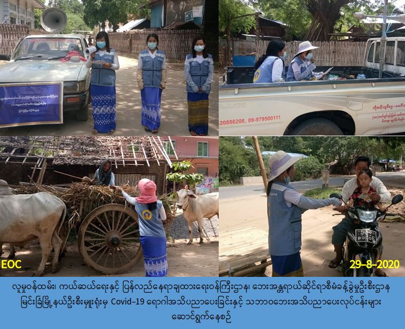 လူမှုဝန်ထမ်း၊ ကယ်ဆယ်ရေးနှင့်ပြန်လည်နေရာချထားရေးဝန်ကြီးဌာန၊ ဘေးအန္တရာယ်ဆိုင်ရာ စီမံခန့်ခွဲမှုဦးစီးဌာန၊ မြင်းခြံမြို့နယ်ဦးစီးမှူးရုံးမှ တာဝန်ရှိသူများသည် (၂၉-၈-၂၀၂၀) ရက်နေ့ တွင် မြင်းခြံမြို့နယ်အတွင်းရှိ အမှတ်(၁၊ ၂၊ ၅၊ ၂၀)၊ လယ်သစ်ကျေးရွာ၊ သစ်ပင်ရှည်ကျေးရွာ၊ ကျောက်ပြုတ်ကျေးရွာ၊ ဓူဝံကျေးရွာ၊ ဇီးပင်ကန်ကျေးရွာ၊ ကျောက်ကုန်းကျေးရွာ၊ တူရွင်းဘို့ ကျေးရွာ၊ ကေျာင်းဖြူကန်ကေျးရွာများသို့ လှည့်လည်ပြီး Covid-19 ကူးစက်ရောဂါ ကြိုတင် ကာကွယ်ရေး၊ မိုးရာသီတွင် ဖြစ်ပွားလေ့ရှိသည့် သဘာဝဘေးအန္တရာယ်များကို ကြိုတင်ပြင်ဆင်ရေးနှင့်ပတ်သက်၍ ပြည်သူလူထုသို့ အသိပညာပေးနှိုးဆော်ခြင်းများနှင့် လက်ကမ်း စာစောင်ပေးအပ်ခြင်းများ ဆောင်ရွက်ခဲ့ပါကြောင်း သတင်းရရှိပါသည်။