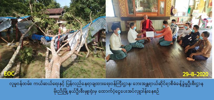 လူမှုဝန်ထမ်း၊ ကယ်ဆယ်ရေးနှင့် ပြန်လည်နေရာချထားရေးဝန်ကြီးဌာန၊ ဘေးအန္တရာယ်ဆိုင်ရာ စီမံခန့်ခွဲမှုဦးစီးဌာန၊ မိုးညိုမြို့နယ်ဦးစီးမှူးရုံးမှ တာဝန်ရှိသူများသည် (၂၈-၈-၂၀၂၀) ရက်နေ့၌ ပဲခူးတိုင်းဒေသကြီး၊ သာယာဝတီခရိုင်၊ မိုးညိုမြို့နယ်၊ ကြို့ပင်သာကျေးရွာအုပ်စု၊ စစ်ကုန်း ကျေးရွာတွင် ဖြစ်ပွားခဲ့သော လေဘေးမှ တစ်စိတ်တစ်ပိုင်းပျက်စီး ဘုန်းတော်ကြီးကျောင်း (၁) ကျောင်းအတွက် ကျောင်းဆောက်ပစ္စည်းဖိုးထောက်ပံ့ငွေ (၁၀၀,၀၀၀/-)ကျပ်၊ စုစုပေါင်း ထောက်ပံ့ငွေ (၁၀၀,၀၀၀/-) ကျပ်အား (၂၉-၈-၂၀၂၀) ရက်နေ့ (၁၃:၃၀) နာရီအချိန်တွင် တိုင်းဒေသကြီး လွှတ်တော်ကိုယ်စားလှယ် (၂) ဦးဝင်းကို၊ မိုးညိုမြို့နယ် အထွေထွေအုပ်ချုပ် ရေးဦးစီးဌာနမှ တာဝန်ရှိသူများ ၊ မိုးညိုမြို့နယ် လူငယ်ရေးရာ အတွင်းရေးမှူး၊ မြို့နယ် မီးသတ်တပ်ဖွဲ့ဝင်များ၊ မြို့နယ်ကြက်ခြေနီအဖွဲ့ဝင်များ၊ ကျေးရွာအုပ်ချုပ်ရေးမှူးနှင့် အတူ ပြည်သူလက်ဝယ်အရောက် ထောက်ပံ့ပေးအပ်ခဲ့ပါကြောင်း သတင်းရရှိပါသည်။