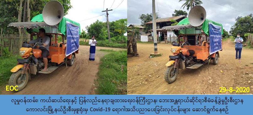 လူမှုဝန်ထမ်း၊ ကယ်ဆယ်ရေးနှင့် ပြန်လည်နေရာချထားရေးဝန်ကြီးဌာန၊ ဘေးအန္တရာယ်ဆိုင်ရာ စီမံခန့်ခွဲမှုဦးစီးဌာန၊ ကောလင်းမြို့နယ်ဦးစီးမှူးရုံးမှ တာဝန်ရှိသူများသည်(၂၉-၈-၂၀၂၀) ရက်နေ့ တွင် ကောလင်းမြို့နယ်၊ ပဇင်းသာ၊ လက်ပံခုံ၊ ချဉ်ပြစ်ခုံ၊ ဇီးကုန်း၊ ကပ္ပလူးကျေးရွာများရှိ ပြည်သူများသို့ Covid-19 ကူးစက်ရောဂါနှင့်ပတ်သတ်၍ ဆောင်ရန်၊ ရှောင်ရန်များကို လှည့် လည်၍အသိပေး ကြေညာခြင်းလုပ်ငန်းဆောင်ရွက်ခဲ့ပါကြောင်း သတင်းရရှိပါသည်။
