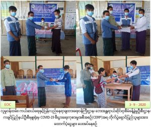 လူမှုဝန်ထမ်း၊ ကယ်ဆယ်ရေးနှင့်ပြန်လည်နေရာချထားရေးဝန်ကြီးဌာန၊ ဘေးအန္တရာယ်ဆိုင်ရာစီမံခန့်ခွဲမှုဦးစီးဌာန၊ ကချင်ပြည်နယ်ဦးစီးမှူးရုံးမှ တာဝန်ရှိသူများသည် (၂-၉-၂၀၂၀)ရက်နေ့တွင် COVID-19 စီးပွားကုစားမှုအစီစဉ်(CERP)အရ စားသောက်ကုန်(၅)မျိုးဝယ်ယူရန်အတွက် တစ်အိမ်ထောင်စုလျှင်(၄၀၀၀ဝိ/-)ကျပ်နှုန်းဖြင့် ကချင်ပြည်နယ်၊ မြစ်ကြီးနားခရိုင်၊ ဝိုင်းမော်မြို့နယ်၊ စန်းကားကျေးရွာ IDPsစခန်းရှိ အိမ်ထောင်စု(၉၁)စုအတွက်(၃၆၄၀၀၀ဝိ/-)၊ မုတ်လွှဲ(ခါးရှို) IDPsစခန်းရှိ အိမ်ထောင်စု(၅၈)စုအတွက် (၂၃၂၀၀၀ဝိ/-)၊အမှတ်(၂)လော်ဝေါ်နှစ်ခြင်းဇုံနယ် IDPs စခန်းရှိ အိမ်ထောင်စု(၈၁)စုအတွက်(၃၂၄၀၀၀ဝိ/-)၊ စုစုပေါင်းတန်ဖိုး(၉၂၀၀၀၀ဝိ/-)အားပြည်သူများလက်ဝယ်အရောက်သွားရောက် ထောက်ပံ့ပေးအပ်ခဲ့ကြောင်း သတင်းရရှိပါသည်။