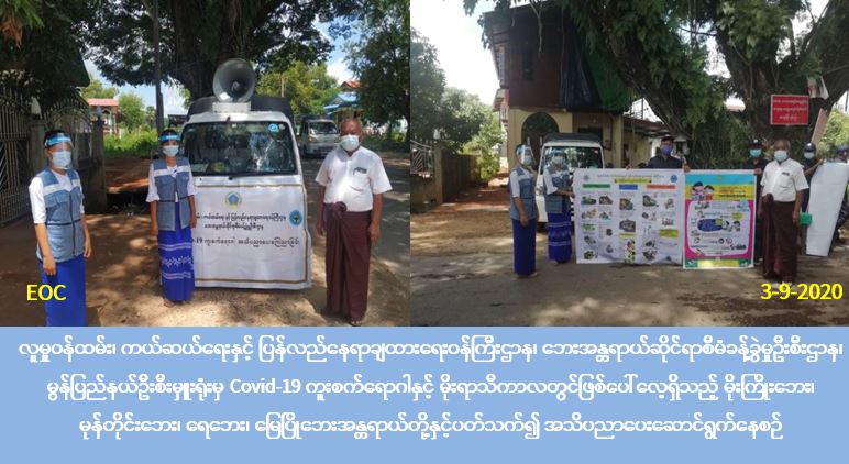 လူမှုဝန်ထမ်း၊ ကယ်ဆယ်ရေးနှင့် ပြန်လည်နေရာချထားရေးဝန်ကြီးဌာန၊ ဘေးအန္တရာယ်ဆိုင်ရာစီမံခန့်ခွဲမှုဦးစီးဌာန၊ မွန်ပြည်နယ်ဦးစီးမှူးရုံးမှ တာဝန်ရှိသူများသည် (၃-၉-၂၀၂၀) ရက်နေ့ (၁၁:၀၀) မှ (၁၄:၀၀) အချိန်ထိ ကျိုက်မရောမြို့နယ်၊ ကျုံမနင်းကျေးရွာ၊ ကျုံဝမ်းကျေးရွာနှင့် ကျိုက်ပရန်ကျေးရွာတို့တွင် Covid-19 ကူးစက်မှုမဖြစ်ပွားစေရန် ကြိုတင်ကာကွယ်ရေးအသိပညာပေးခြင်းနှင့် မိုးရာသီကာလတွင် ဖြစ်ပွားတတ်သော မိုးကြိုးဘေး၊ မုန်တိုင်:ဘေး၊ ရေဘေး၊ မြေပြိုဘေးအန္တာရယ်များ ကြိုတင်ပြင်ဆင်ရေး အသိပညာပေးခြင်းတို့အား ပြုလုပ်ခဲ့ပြီး ဗီနိုင်းပိုစတာများ ပေးအပ်ခဲ့ပါကြောင်း သတင်းရရှိပါသည်။