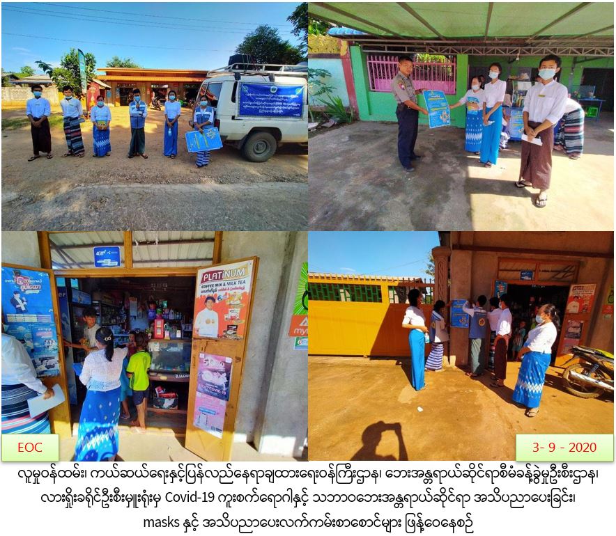 လူမှုဝန်ထမ်း၊ ကယ်ဆယ်ရေးနှင့်ပြန်လည်နေရာချထားရေးဝန်ကြီးဌာန၊ ဘေးအန္တရာယ်ဆိုင်ရာစီမံခန့်ခွဲမှုဦးစီးဌာန၊ လားရှိုးခရိုင်ဦးစီးမှူးရုံးမှ တာဝန်ရှိသူများသည် (၃-၉-၂၀၂၀) ရက်နေ့တွင် လူမှုဝန်ထမ်းဦးစီးဌာန၊ ပြန်လည်ထူထောင်ရေးဦးစီးဌာနမှ တာဝန်ရှိသူများနှင့်အတူ လားရှိုးမြို့ ၊ မြို့မကျေးရွာအုပ်စု၊ မယ်ဟန်ကျေးရွာနှင့် ကောင်းကြဲ(အီ)ကျေးရွာတို့၌ Covid-19 ကူးစက်မှုမဖြစ်ပွားစေရန်ပြည်သူများ လိုက်နာရမည့်ကျန်းမာရေးအမူအကျင့်များ အသိပညာပေးခြင်းနှင့် သဘာဝဘေးဆိုင်ရာအသိပညာပေးခြင်းများကို အသံချဲ့စက်များဖြင့် လှည့်လည်ဟောပြောခဲ့ပြီး Mask နှင့် အသိပညာပေးလက်ကမ်းစာစောင်များ ဖြန့်ပေးဝေခြင်း၊ Hand Gelများဖြင့် လက်သန့်စင်ပေးခြင်းတို့အား ဆောင်ရွက်ခဲ့ကြောင်း သတင်းရရှိပါသည်။