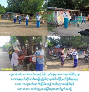 လူမှုဝန်ထမ်း၊ ကယ်ဆယ်ရေးနှင့် ပြန်လည်နေရာချထားရေးဝန်ကြီးဌာန၊ ဘေးအန္တရာယ်ဆိုင်ရာစီမံခန့်ခွဲမှုဦးစီးဌာန၊ မိုးမိတ်မြို့နယ်ဦးစီးမှူးရုံးမှ တာဝန်ရှိသူများသည် (၅-၉-၂၀၂၀) ရက်နေ့တွင် လူမှုဝန်ထမ်းဦးစီးဌာနနှင့်ပူးပေါင်း၍ မိုးမိတ်မြို့နယ်၊ ဟော်နန်းရပ်ကွက်၊ယာယီကုန်စိမ်းဈေးနှင့် မြို့မဈေးတို့တွင် Covid-19 ရောဂါ ကူးစက်မှုမဖြစ်ပွားစေရန် ပြည်သူများ နေထိုင်ရ မည့် ကျန်းမာရေးအမူအကျင့်များ အသိပညာပေးဟောပြောခြင်း၊ အခြားသောသဘာဝဘေးများနှင့်ပတ်သက်သည့် ဆောင်ရန်/ ရှောင်ရန်များကို ကျေးရွာနေပြည်သူတို့အား အသိပညာပေးအစီအစဉ်ကို အသံချဲ့စက်အသုံးပြု၍ ဟောပြောခြင်း၊ နှာခေါင်းစည်း (Mask)များ ဖြန့်ဝေခြင်းနှင့် လက်ကမ်းစာစောင်များဖြန့်ဝေခြင်းတို့ ဆောင်ရွက်ခဲ့ပါကြောင်း သတင်းရရှိပါသည်။