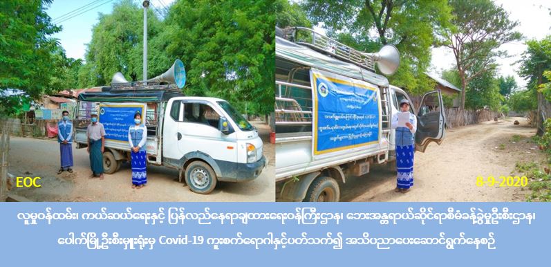 လူမှုဝန်ထမ်း၊ ကယ်ဆယ်ရေးနှင့် ပြန်လည်နေရာချထားရေးဝန်ကြီးဌာန၊ ဘေးအန္တရာယ်ဆိုင်ရာစီမံခန့်ခွဲမှုဦးစီးဌာန၊ ပေါက်မြို့နယ်ဦးစီးမှူးရုံးမှ တာဝန်ရှိသူများသည် (၈-၉-၂၀၂၀) ရက်နေ့တွင် ပေါက်မြို့နယ်၊ အင်းတောကျေးရွာအုပ်စု၊ အုန်းတော(တ)ကျေးရွာ၊ အုန်းတော(မ)ကျေးရွာနှင့် သံပရာအိုင့်ကျေးရွာအုပ်စု၊ ယာကြီးပြင်ကျေးရွာတို့တွင် Covid-19 ကူးစက်ရောဂါကြိုတင်ကာကွယ်ရေး အသိပညာပေးနှိုးဆော်မှုများ ဆောင်ရွက်ခဲ့ပါကြောင်း သတင်းရရှိပါသည်။