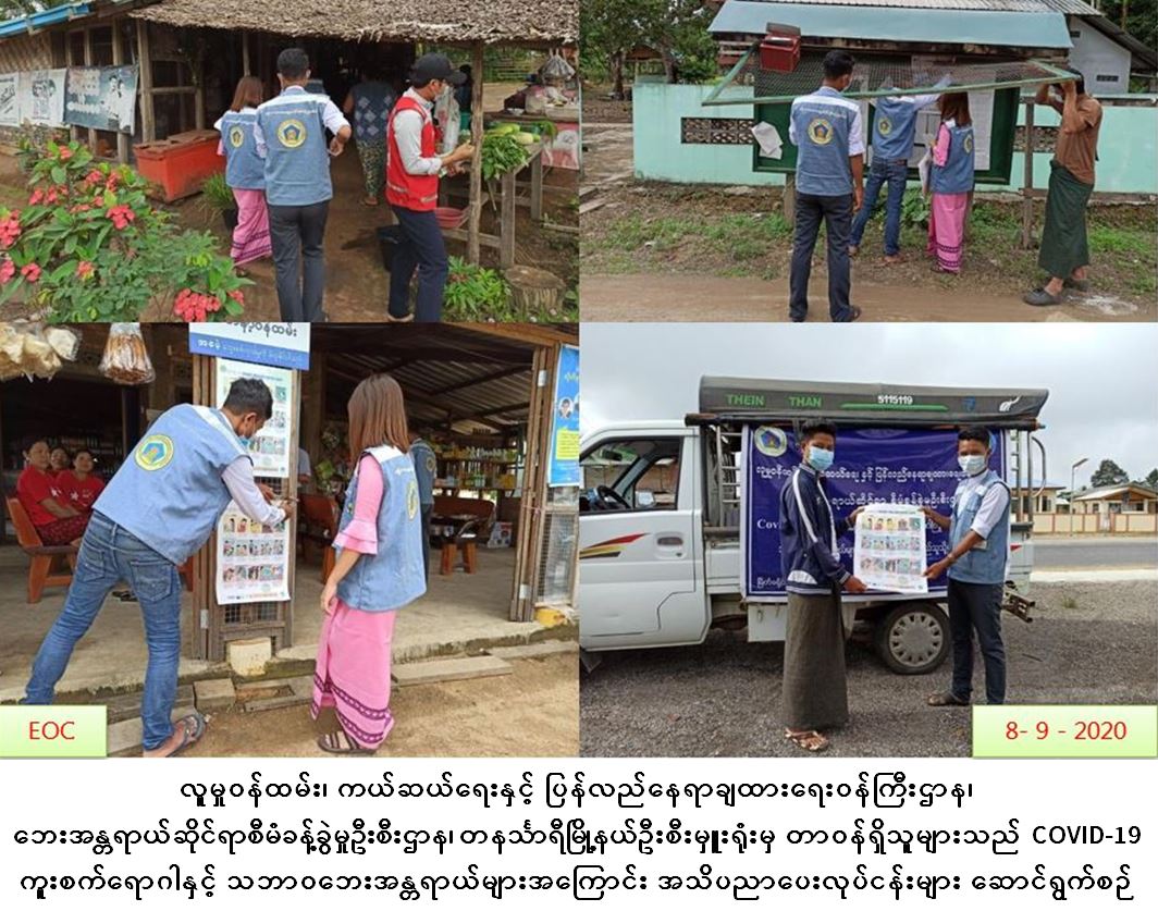 လူမှုဝန်ထမ်း၊ ကယ်ဆယ်ရေးနှင့်ပြန်လည်နေရာချထားရေးဝန်ကြီးဌာန၊ ဘေးအန္တရာယ်ဆိုင်ရာစီမံခန့်ခွဲမှုဦးစီးဌာန၊တနင်္သာရီမြို့နယ်ဦးစီးမှူးရုံးမှ(၈.၉.၂၀၂၀)ရက်နေ့ တနင်္သာရီမြို့နယ်၊ သိန်ခွန်းကျေးရွာအုပ်စု၊ ထုံခါကျေးရွာ၊ ကော့ယွန်းကျေးရွာ၊ ချောင်းနှစ်ပေါက်ကျေးရွာ၊ သိန်ခွန်းကျေးရွာနှင့်၊ သဲဖြူကျေးရွာများတွင် Covid-19 အသိပညာပေးခြင်း၊ လက်ကမ်းစာစောင်နှင့် ပိုစတာများဖြန့်ဝေခြင်း၊ မိုးကြိုးဘေး၊ ရေဘေး၊ မြေပြိုဘေးနှင့်ပက်သက်သည့် ဆောင်ရန်၊ ရှောင်ရန်များအတွက် အသိပညာပေးခြင်းတို့ကို မြို့နယ်ကြက်ခြေနီ၊ ရပ်ကျေးအုပ်ချုပ်ရေးမှုးများနှင့်အတူ နံနက် (၀၇:၀၀) မှ (၁၂း၀၀) အချိန်ထိ ပူးပေါင်းဆောင်ရွက်ခဲ့ကြောင်း သတင်းရရှိပါသည်။