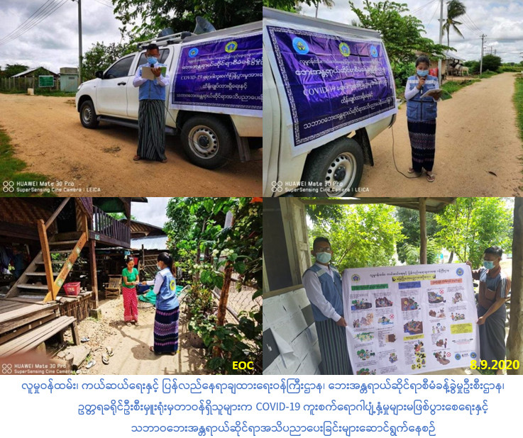 လူမှုဝန်ထမ်း၊ ကယ်ဆယ်ရေးနှင့် ပြန်လည်နေရာချထားရေးဝန်ကြီးဌာန၊ ဘေးအန္တရာယ်ဆိုင်ရာစီမံခန့်ခွဲမှုဦးစီးဌာန၊ ပြည်ထောင်စုနယ်မြေ၊ နေပြည်တော်၊ ဥတ္တရခရိုင်ဦးစီးမှူးရုံးမှ တာဝန်ရှိသူများသည် (၈-၉-၂၀၂၀)ရက်နေ့၊ (၁၀:၀၀) အချိန်မှ (၁၄:၀၀) အချိန်အထိ ပြည်သူများအား COVID-19 ရောဂါကူးစက်ပြန့်နှံ့မှုများ မဖြစ်ပွားစေရန်အတွက် သိရှိလိုက်နာ ဆောင်ရွက်ရမည့်အချက်များနှင့် မိုးရာသီကာလအတွင်းဖြစ်ပွားတတ်သည့် ရေဘေးအန္တရာယ်နှင့် မိုးကြိုးဘေးအန္တရာယ်ဆိုင်ရာ ဆောင်ရန်/ ရှောင်ရန်အချက်များနှင့် ပတ်သက်၍ ပုဗ္ဗသီရိမြို့နယ်၊ အေးမြင့်သာယာကျေးရွာအုပ်စု၊ အေးမြင့်သာယာကျေးရွာ၊ ပေါက်တောကျေးရွာ၊ တောက်ထိန် ကျေးရွာ၊ စက်ကုန်းကျေးရွာ၊ ဝက်ကုန်းကျေးရွာ၊ ခါးပြတ်ကျေးရွာများအတွင်းရှိ ပြည်သူများသို့ လက်ကမ်းစာစောင်များဖြန့်ဝေပေးအပ်၍ ထိရောက်စွာအသိပညာပေးခြင်းများအား ဆောင်ရွက်ခဲ့ ပါကြောင်း သတင်းရရှိပါသည်။
