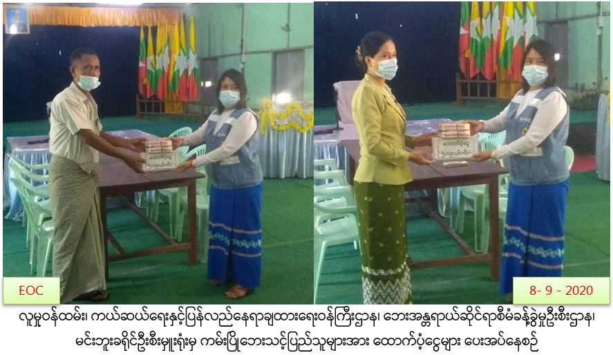 လူမှုဝန်ထမ်း၊ ကယ်ဆယ်ရေးနှင့်ပြန်လည်နေရာချထားရေးဝန်ကြီးဌာန၊ ဘေးအန္တရာယ်ဆိုင်ရာစီမံခန့်ခွဲမှုဦးစီးဌာန၊ မင်းဘူးခရိုင်ဦးစီးမှူးရုံးမှ တာဝန်ရှိသူများသည် မင်းဘူးခရိုင်၊ စလင်းမြို့နယ်၊ ကျောက်ရဲကျွန်းကျေးရွာ၊ ဆင်မကျွန်းကျေးရွာ၊ ဥယျာဥ်စုကျေးရွာနှင့် ကြူတော(မ)ကျေးရွာတို့တွင် (၂-၉-၂၀၂၀)ရက်နေ့၌ ဖြစ်ပွားခဲ့သော ဧရာဝတီမြစ်ရေတိုက်စား၍ ကမ်းပါးပြိုကျမည်ကို စိုးရိမ်မှုကြောင့် ကြိုတင်ပြောင်းရွှေ့အိမ်ခြေ(၄၇)လုံး၊ အိမ်ထောင်စု(၄၇)စုတို့အတွက် အိမ်ဆောက်ပစ္စည်းဖိုး(၄,၇၀၀,၀၀၀ိ/-)၊ လူဦးရေ(၁၈၆)ဦးအတွက် ဆန်ရိက္ခါ(၇)ရက်စာ (၃၉၀,၆၀၀ိ/-)ကျပ်၊ စုစုပေါင်းထောက်ပံ့ငွေ(၅,၀၉၀,၆၀၀ိ/-)အား (၈-၉-၂၀၂၀)ရက်နေ့၊ (၁၅:၀၀)အချိန်တွင် အထွေထွေအုပ်ချုပ်ရေးဦးဌာနမှ တာဝန်ရှိသူများနှင့်အတူ ဘေးသင့်ပြည်သူများ လက်ဝယ်အရောက် သွားရောက်ထောက်ပံ့ပေးအပ်ခဲ့ကြောင်း သတင်းရရှိပါသည်။