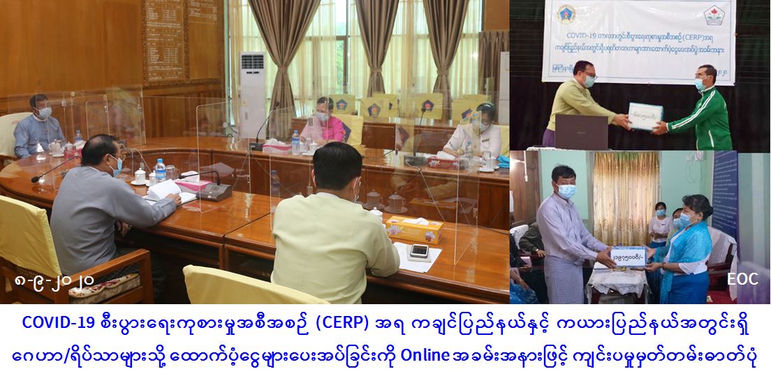 လူမှုဝန်ထမ်း၊ ကယ်ဆယ်ရေးနှင့် ပြန်လည်နေရာချထားရေးဝန်ကြီးဌာန၊ ဒုတိယဝန်ကြီး ဦးစိုးအောင်သည် COVID-19 စီးပွားရေးကုစားမှုအစီအစဉ်(CERP)အရ ကချင်ပြည်နယ်နှင့် ကယား ပြည်နယ်အတွင်းရှိ ဂေဟာ/ရိပ်သာများသို့ ထောက်ပံ့ငွေများပေးအပ်ခြင်းကို Online အခမ်းအနားဖြင့် ကျင်းပရာတွင် တက်ရောက်၍ အမှာစကားပြောကြားခဲ့သည်။