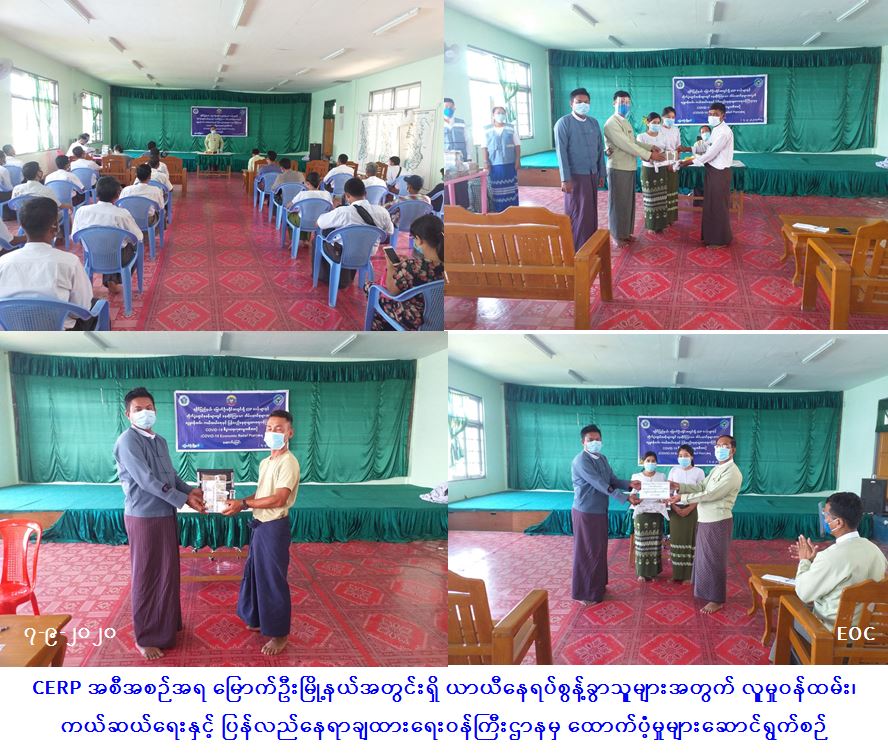 အဆိုပါ CERP အစီအစဉ်အရ စားသောက်ကုန်(၅)မျိုးဝယ်ယူရန်အတွက် မြောက်ဦးမြို့နယ်၊ ကျောက်ကျပ်အုပ်စု၊ စေတီတောင်ရွာဟောင်း ဘုန်းတော်ကြီးကျောင်းရှိ အိမ်ထောင်စု(၇၆)စု၊ ညောင်ပင်ဈေးရပ်ကွက်၊ သျှစ်သောင်းဘုန်းတော်ကြီးကျောင်းရှိ အိမ်ထောင်စု(၁၄၂)၊ ရှော်မယ်အမကရှိ အိမ်ထောင်စု(၅၁)စု၊ မြတန်ဆောင်းဘုန်းတော်ကြီးကျောင်းရှိ အိမ်ထောင်စု(၂၇၂)စု၊ လက်ကောက် ဈေးဘုန်းတော်ကြီးကျောင်းရှိ အိမ်ထောင်စု(၃၂၇)စု၊ ဘုရားပေါ်ဘုရားသိမ်ရှိ အိမ်ထောင်စု(၈၀)စု၊ ထမ္မရာဇ်မြို့ကွက်သစ်ရှိ အိမ်ထောင်စု(၃၄)စု၊ သံချောင်းကျေးရွာအုပ်စု၊ ပီပင်ရင်းကျေးရွာဘုန်းကြီး ကျောင်းရှိ အိမ်ထောင်စု(၄၉၀)စု၊ တင်းထိန်ကန်ကျေးရွာ၊ ဘုန်းကြီးကျောင်းဓမ္မာရုံရှိ အိမ်ထောင်စု (၁၈၈)စု၊ မော်ရွာအုပ်စု၊ စင်းဘောကိုင်းကျေးရွာရှိ အိမ်ထောင်စု(၇၁၁)စု၊ တင်းထိန်ကန်အုပ်စု၊ ရွာသစ်ကေဘုန်းတော်ကြီးကျောင်းရှိ အိမ်ထောင်စု(၁၁၄)စု၊ အောင်တပ်ရပ်ကွက်၊ အောင်စေတီ ဘုရားသိမ်ရှိ အိမ်ထောင်စု(၇၀)စု၊ နရတ်စားဘုရားသိမ်ရှိ အိမ်ထောင်စု(၃၉)စု၊ ဝက်လှကျေးရွာ ဘုန်းတော်ကြီးကျောင်းရှိ အိမ်ထောင်စု(၉၆)စု၊ တိန်ညိုကျေးရွာရှိ အိမ်ထောင်စု(၈၄၅)စု၊ အောင်တပ်ရပ်ကွက်၊ မြို့သစ်ဘုန်းတော်ကြီးကျောင်းရှိ အိမ်ထောင်စု(၂၂၄)စု၊ အောင်တပ်ရပ်ကွက်၊ ဒိုင်းဂျီဘုန်းတော်ကြီးကျောင်းသစ်ရှိ အိမ်ထောင်စု(၆၈)စု၊ အောင်တပ်ရပ်ကွက်၊ ဒိုင်းဂျီဘုန်းတော်ကြီး ကျောင်းဟောင်းရှိ အိမ်ထောင်စု(၈၅)စု၊ တောင်မြင့် ကျေးရွာဘုန်းတော်ကြီးကျောင်းဓမ္မာရုံရှိ အိမ်ထောင်စု(၆၁)စု၊ အောင်တပ်ရပ်ကွက်၊ ကိုးနဝင်းဘုန်း တော်ကြီးကျောင်းရှိ အိမ်ထောင်စု(၃၉)စု၊ ပြလှကျေးရွာ၊ ဘုန်းတော်ကြီးကျောင်းရှိ အိမ်ထောင်စု (၁၇၅)စု၊ နကန်ကျေးရွာ(အရှေ့) ဘုန်းတော်ကြီးကျောင်းရှိ အိမ်ထောင်စု(၃၂)စု၊ ပုဇွန်ဖေကျေးရွာရှိ အိမ်ထောင်စု(၇၈)စု၊ ကုလားချောင်းဘုန်းတော်ကြီးကျောင်းရှိ အိမ်ထောင်စု(၁၂၄)စု၊ ရွှေထီးဆောင်း ဘုန်းတော်ကြီး ကျောင်းရှိ အိမ်ထောင်စု(၈၄)စုနှင့် ကျောက်ရာစ်ကေဘုန်းတော်ကြီးကျောင်းရှိ အိမ်ထောင်စု(၁၁၀)စု၊ စုစုပေါင်း ယာယီတိုက်ပွဲရှောင်စုရပ်(၂၆)ခုရှိ အိမ်ထောင်စု(၄၆၁၅)စုတို့အတွက် ထောက်ပံ့ငွေ စုစုပေါင်း (၁၈၄,၆၀၀,၀၀ဝိ/-)ကို မြောက်ဦးခရိုင်ဦးစီးမှူးရုံးမှ တာဝန်ရှိသူများက (၇-၉-၂၀၂၀) ရက်နေ့တွင် မြောက်ဦးမြို့နယ်အထွေထွေအုပ်ချုပ်ရေးဦးစီးဌာနခန်းမ၌ မြောက်ဦးမြို့နယ် အုပ်ချုပ် ရေးမှူးနှင့် ကျေးရွာ/ရပ်ကွက်အုပ်ချုပ်ရေးမှူးများ ရှေ့မှောက်တွင် ထောက်ပံ့ခဲ့ပါကြောင်းနှင့် ထောက်ပံ့ရန်ကျန်ရှိသည့် စစ်တွေ၊ ပေါက်တော၊ ရသေ့တောင်၊ ပုဏ္ဏားကျွန်း၊ မင်းပြား၊ မြေပုံနှင့် အမ်းမြို့နယ်များရှိ တိုက်ပွဲရှောင်နေရပ်စွန့်ခွာသူများအား ထောက်ပံ့က